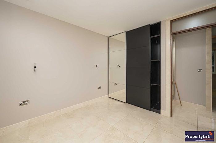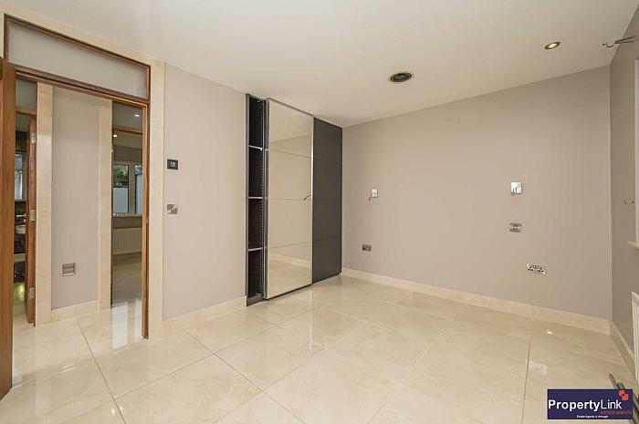 Generous double bedroom with fitted wardrobes, frontal aspect window views and marble tiled floor.