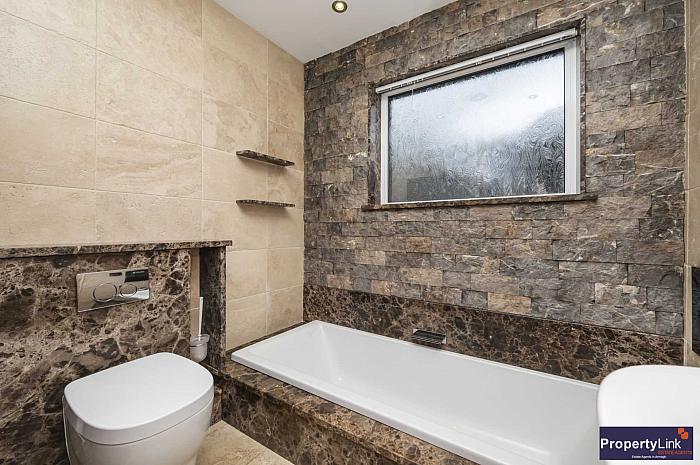 Fitted units to include space to house auto washers, chrome towel rail and marble tiled floor.