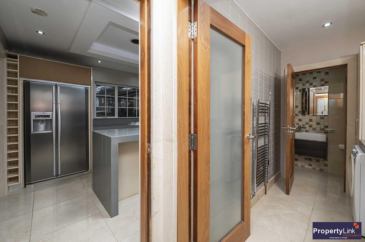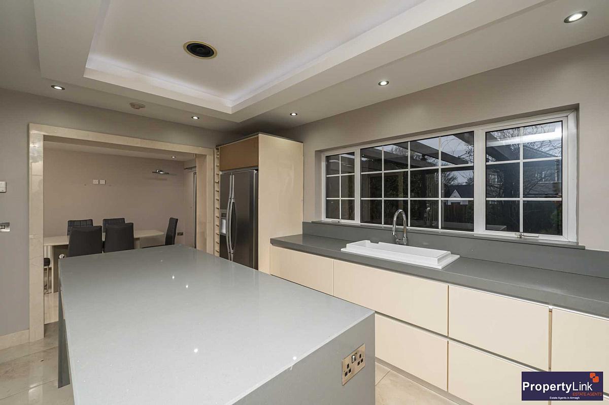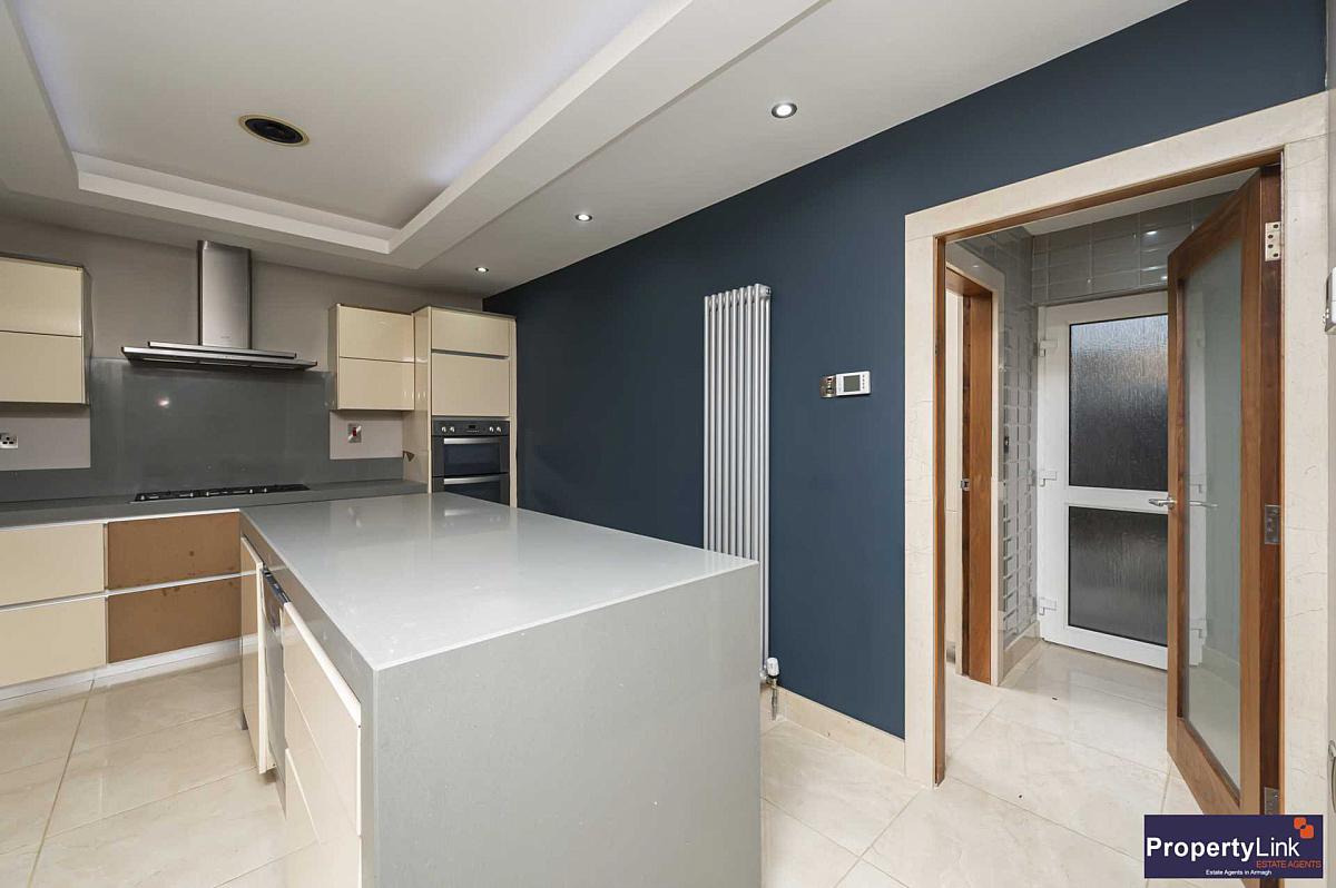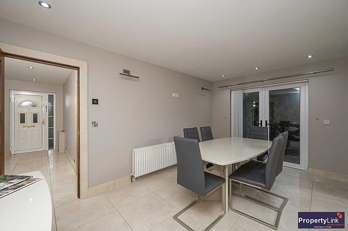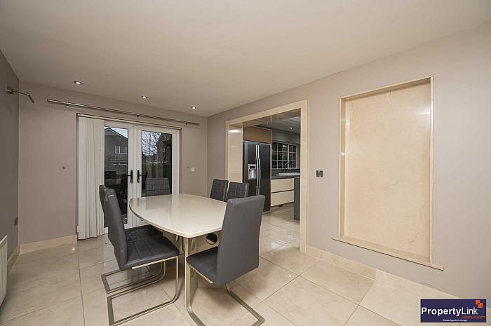 High and low fitted white gloss units to include space to house fridge freezer, high level double electric oven, gas hob with extractor fan over, Belfast sink and drainer, centre island to include storage space and intergrated dishwasher, Open plan to dining room and finished with marble tiled floors. Direct access to rear hall.