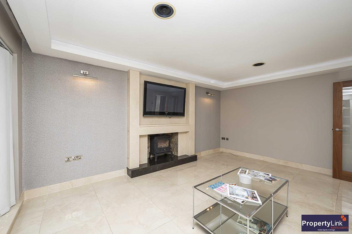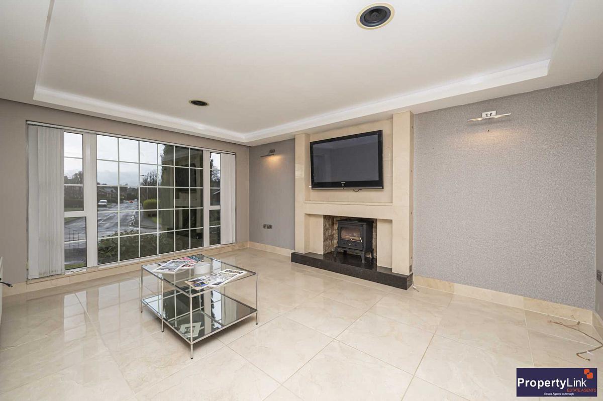 Spacious lounge area offering frontal aspect window views, wood burning stove with marble media wall over. Tiled floor.
