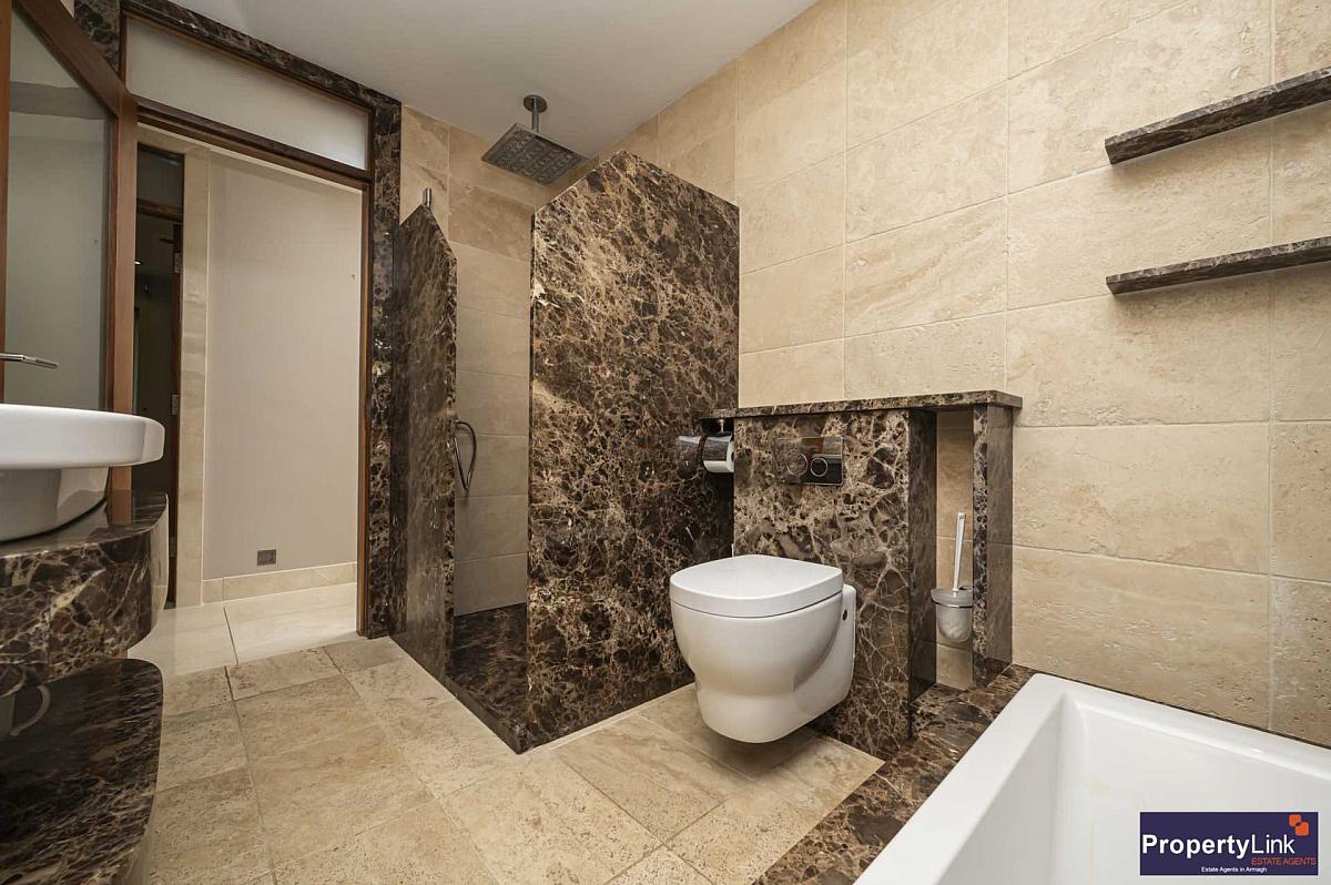 Four piece suite to include his and her sink on marble floating shelves, walk in shower with rain head and marble surrounds, floating WC, sunken bath with recessed lights and TV unit, chrome towel rail and marble tiled floor.