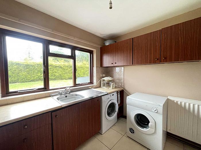 Range of fitted high and low units to include stainless steel sink and drainer, plumbed for washing machine, hot press and storage off and ceramic tiled floor.