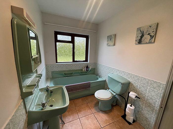 Four piece coloured suite to include low flush WC, pedestal wash hand basin, panel bath, electric shower and ceramic tiled floor.