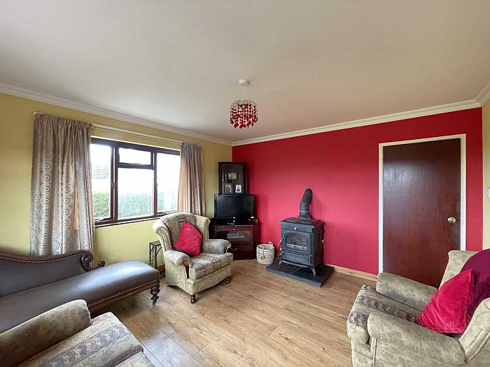 Generous second reception room offering frontal aspect window views, laminated wooden floor and multi fuel stove with back boiler.