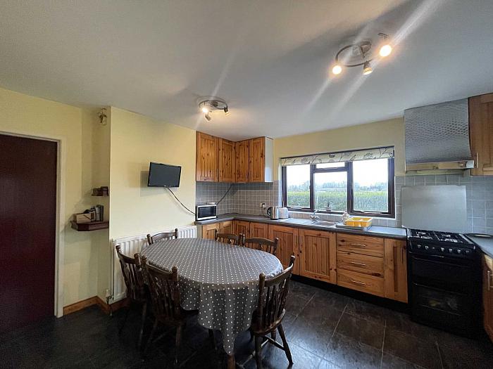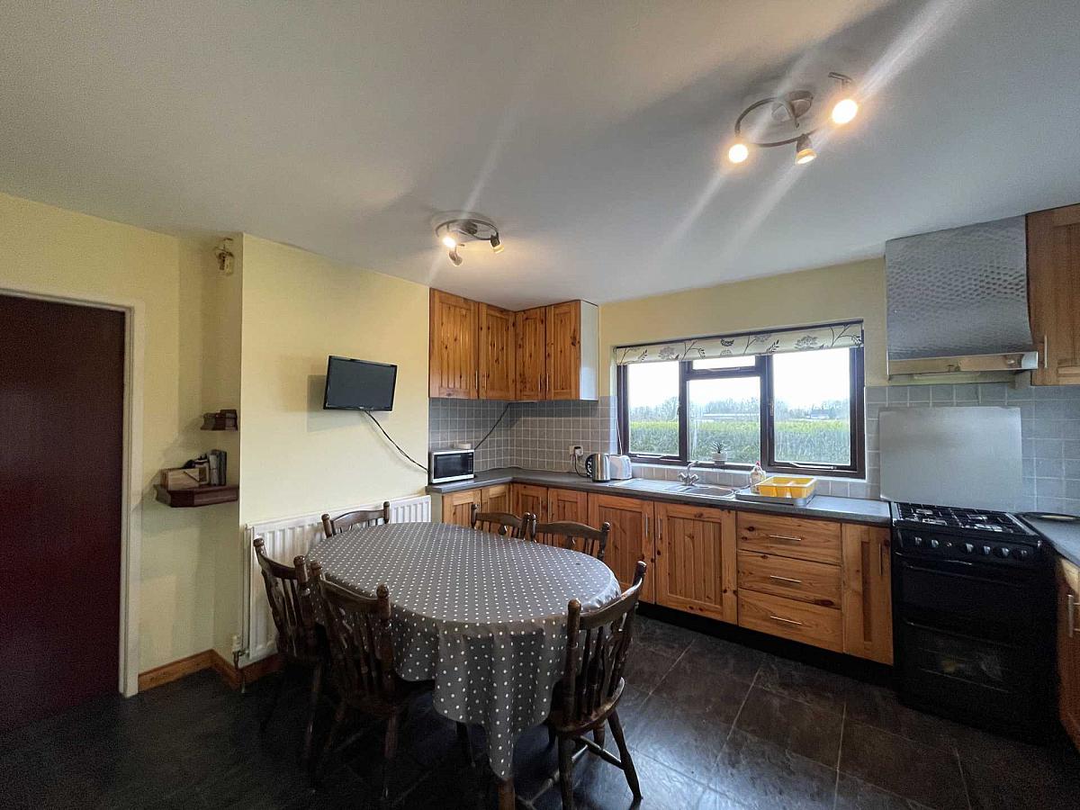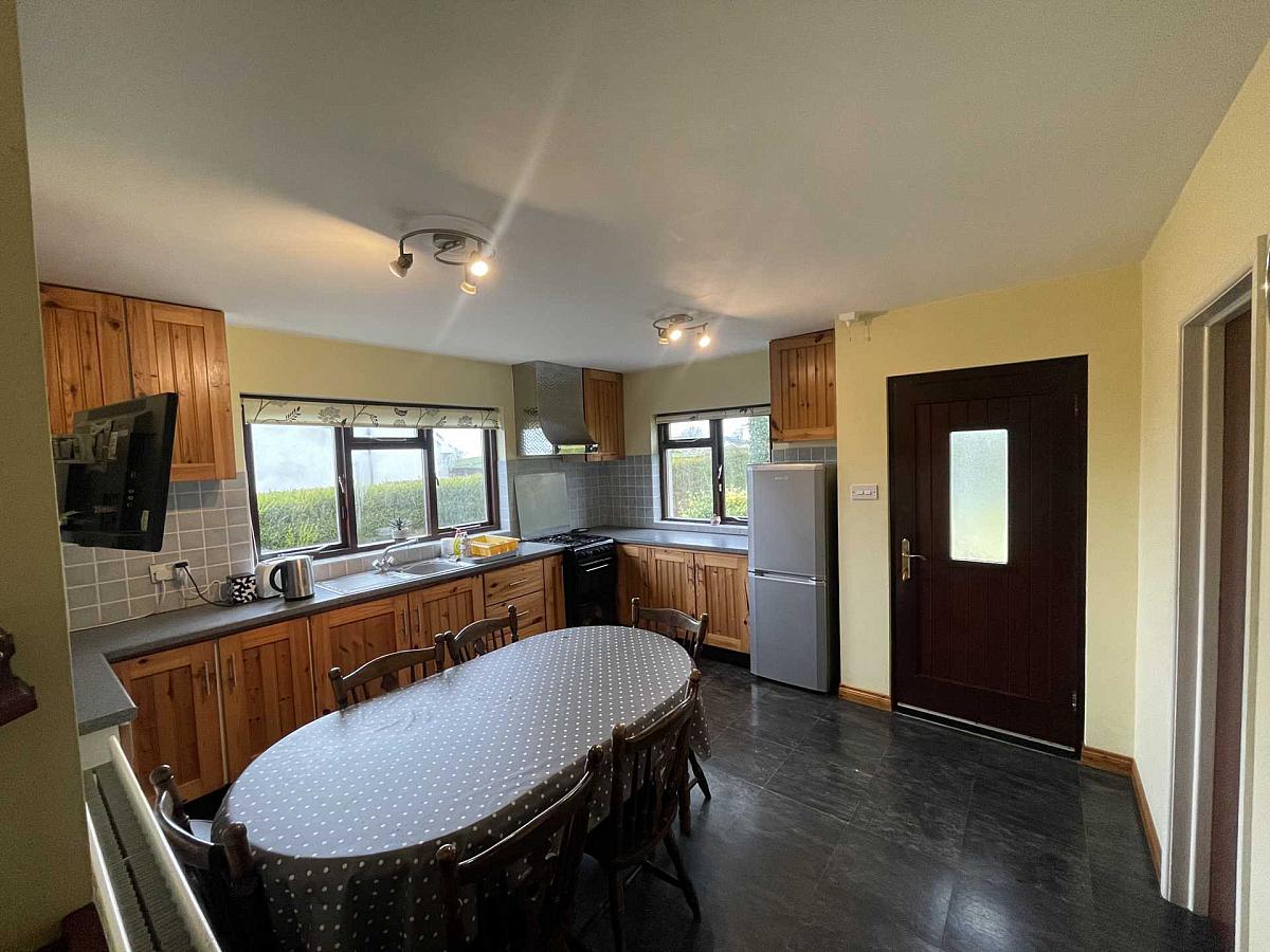 Range of pine fitted high and low level units to include stainless steel sink and drainer, space to house gas cooker with extractor fan over, space to house fridge/freezer, PVC rear door access, and ample space to house dining table.