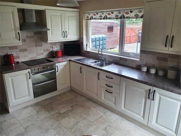Accommodation Entrance Hall Hardwood glazed front door with glazed side panel. Hotpress and storage cupboard off. Access to roof space. Lounge 13` 6" x 10` 6" (4.11m x 3.20m) Electric fire with wooden surround. Kitchen 13` 2" x 9` 9" (4.01m x 2.97m) Range of modern Cream fitted high and low level units, built in ceramic hob, built in electric double oven with stainless steel canopy and extractor fan over, integrated fridge/freezer, part tiled walls and tiled floor. Bedroom 1 10` 3" x 10` 2" (3.12m x 3.10m) Built in wardrobe. Bedroom 2 10` 8" x 8` 8" (3.25m x 2.64m) Built in wardrobe. Bathroom 7` 2" x 6` 5" (2.18m x 1.96m) Low flush WC, sink in vanity unit with mirror and light over, shower cubical suitable for disability needs, fully tiled walls. Garden Enclosed garden to the rear offering a paved area for vehicle parking, the garden is tastefully landscaped in lawn to the rear and side with ornamental flower and shrub beds. Garden to front in lawn with flower beds.