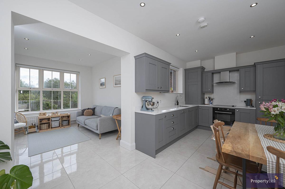 Composing of high and low modern fitted units to include stainless steel sink and drainer, intergrated dishwasher and fridge/freezer , electric oven with hob and extractor fan over, ceramic tiled floor, ample space to house dining table and open plan to the sun lounge.