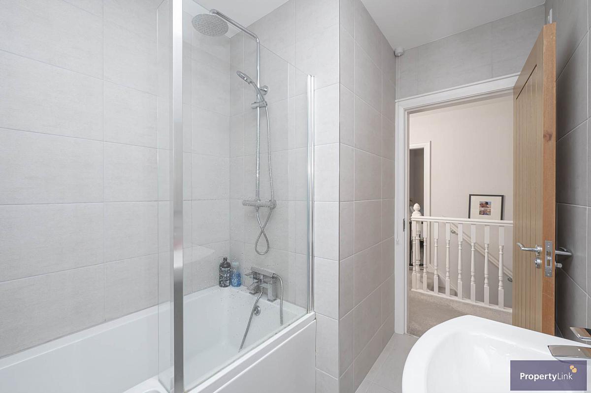 Three piece suite to include panel bath with electric shower and rain head over, sink in vanity, low flush wc and fully tiled ceramic floor and walls.