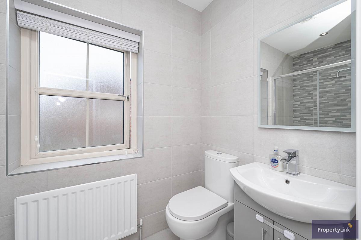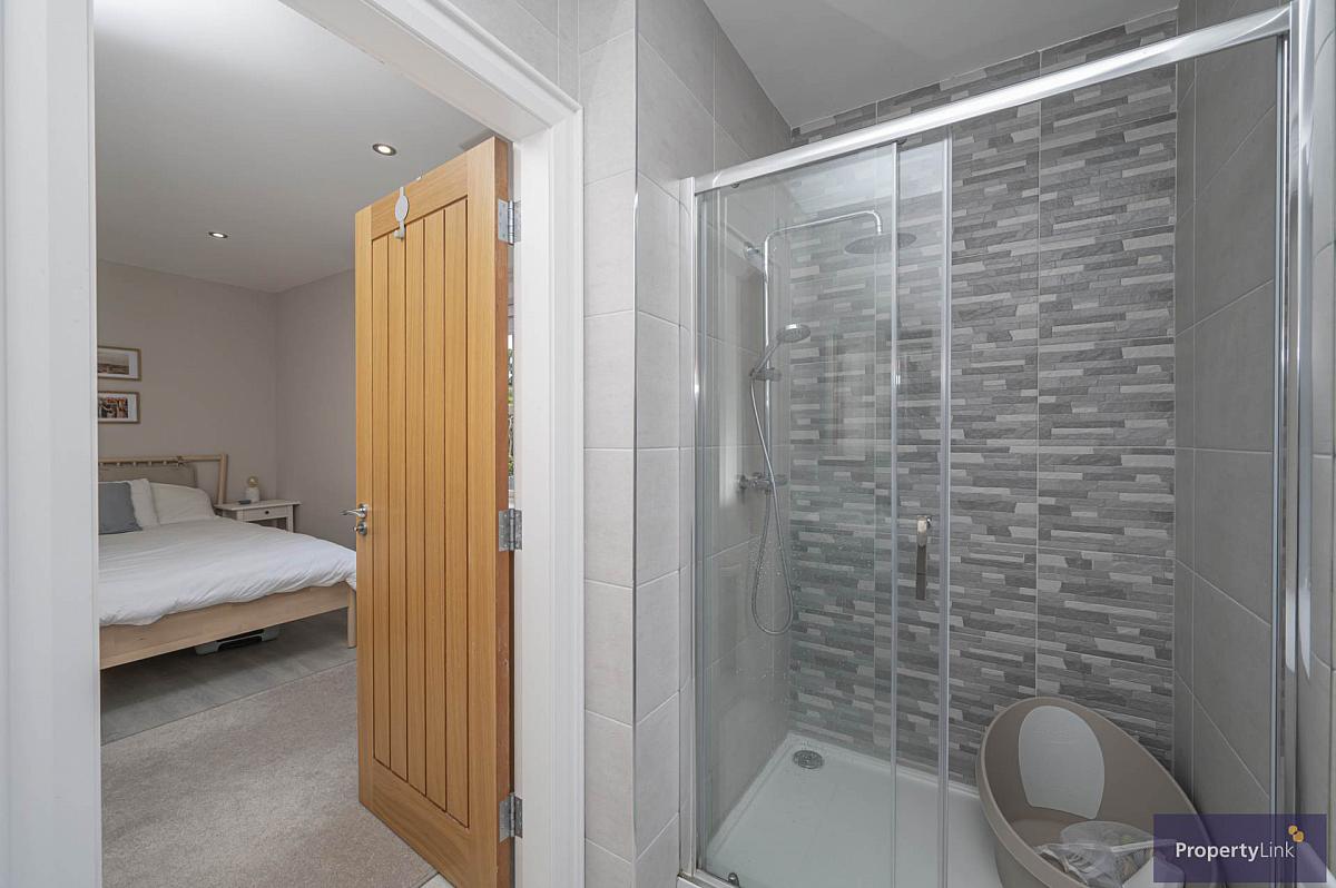 A spacious frontal aspect bedroom offering laminated wooden floor, ample space to house double bed and en-suite to include shower with rain head, sink in vanity, low flush WC and ceramic tiled floor and walls