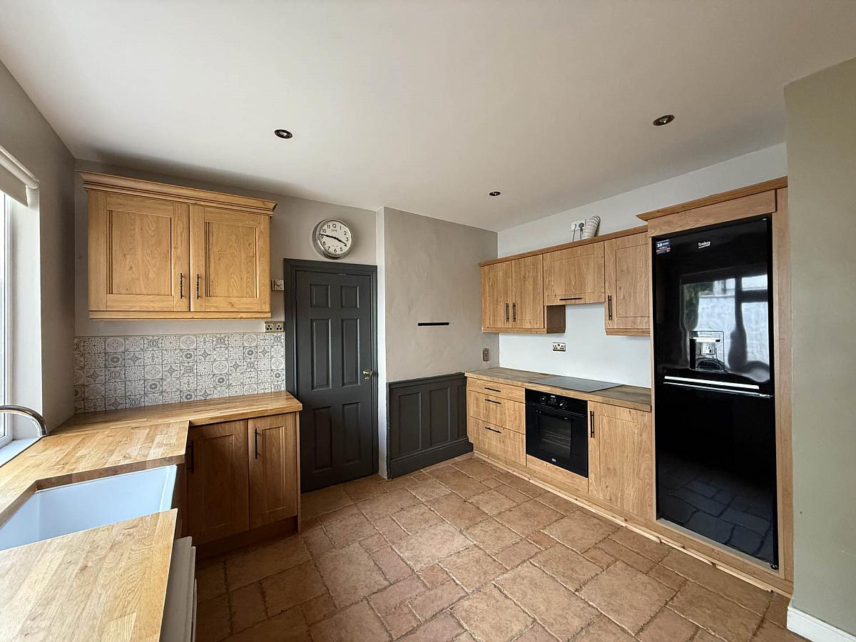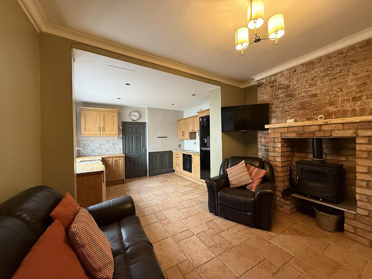 High and low level fitted units to include Belfast sink, space to house fridge/freezer and dishwasher, electric oven with hob and extractor fan over, feature red brick fire place with multi fuel wood burning stove, ceramic tiled floor and ample space to house dining table.
