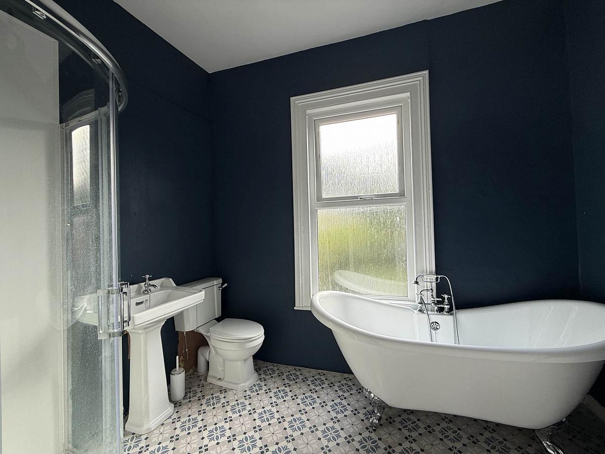 Four piece suite to include pedestal wash hand basin, low flush wc, free standing bath, electric shower and ceramic tiled floor.