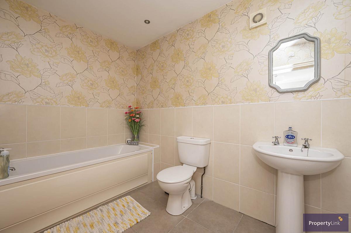 Three piece suite to include pedestal wash hand basin, low flush WC, panel bath and ceramic tiled floor.
