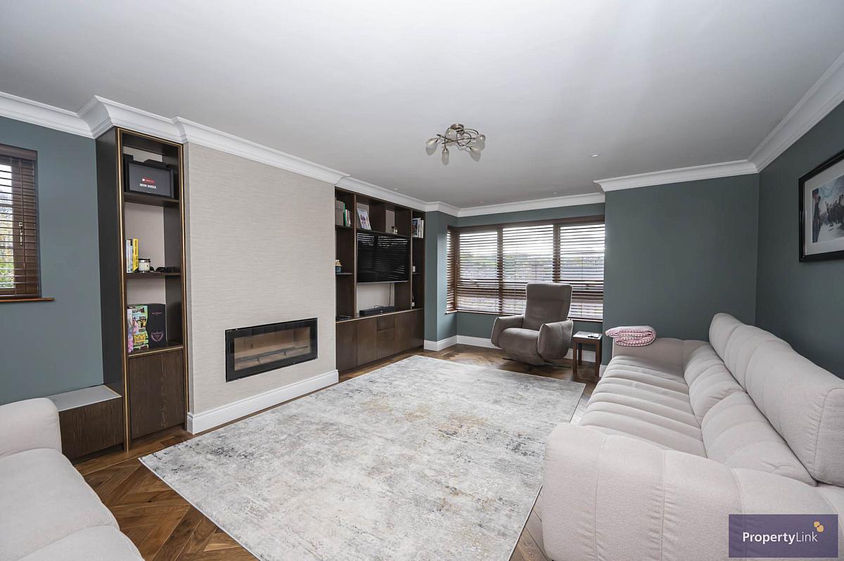 Offering parke effect solid floor covering, frontal aspect window views, glass double doors leading to hallway and feature media wall to include glass front stovax fire.