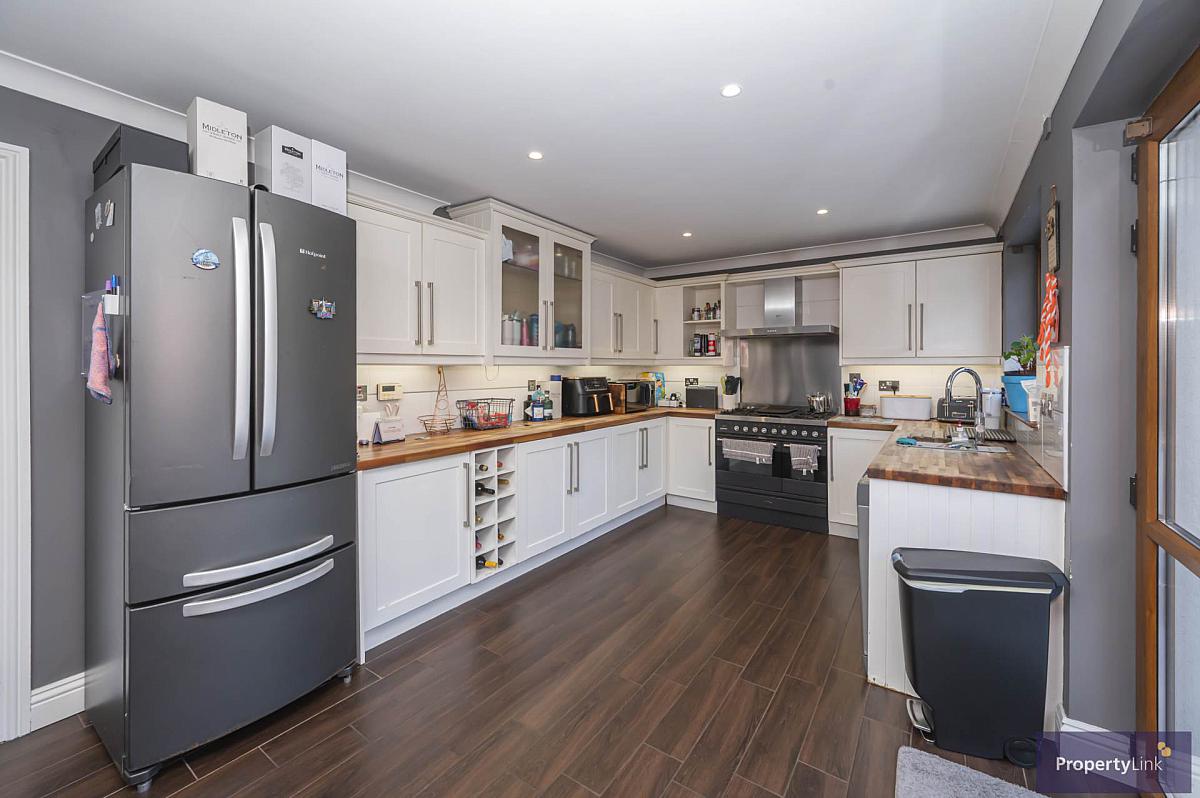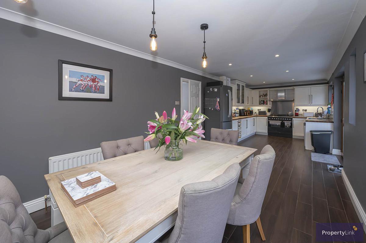 Spacious rear aspect kitchen dining area offering fitted units to include space to house dishwasher, gas hob with electric oven and extractor fan over, ceramic sink and drainer with quooker tap over, ceramic tiled floor, and ample space to house dining table.