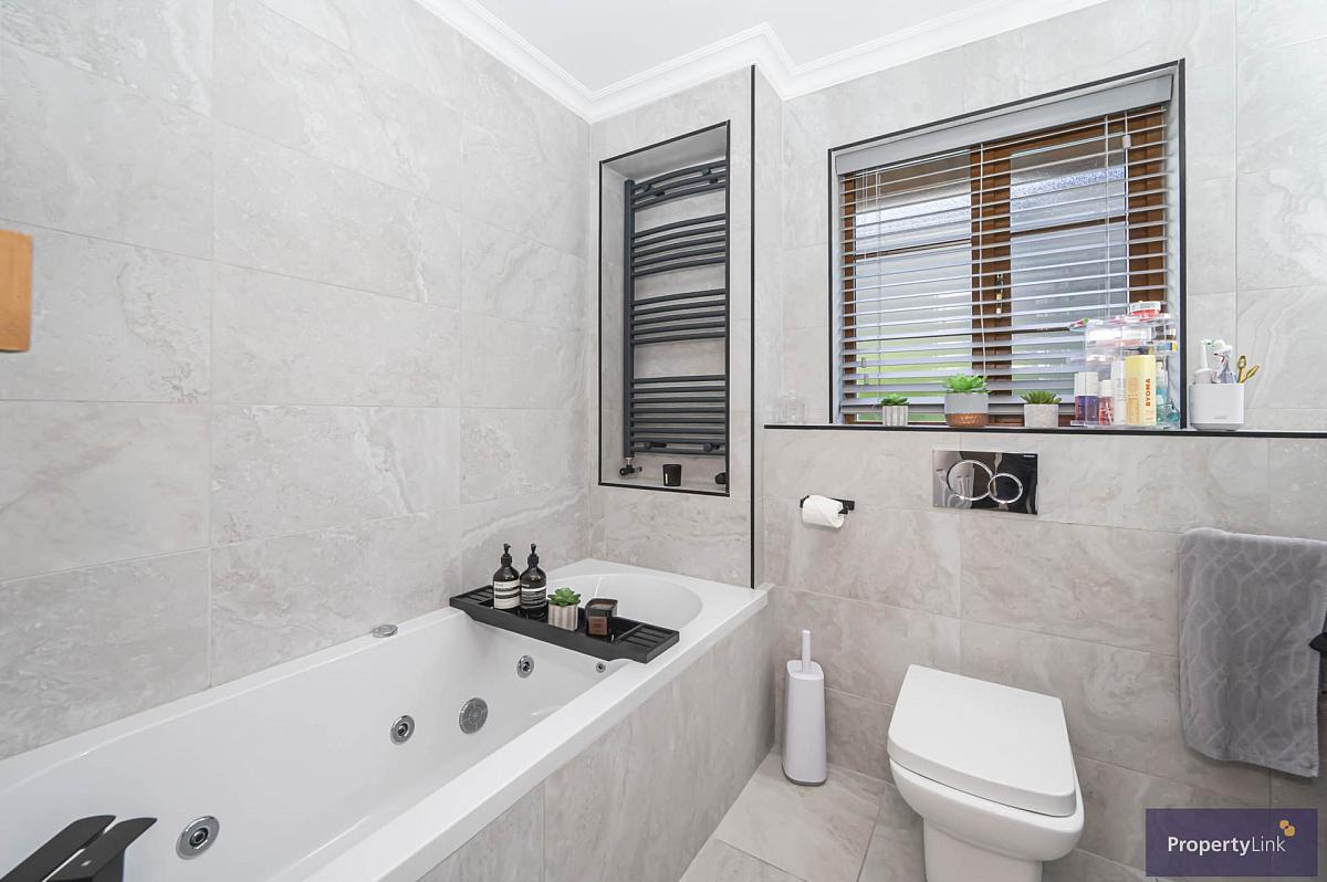 Four piece suite to include jacuzzi bath, towel heater, shower with rain head, sink in vanity, floating toilet and ceramic tiled floor and walls.