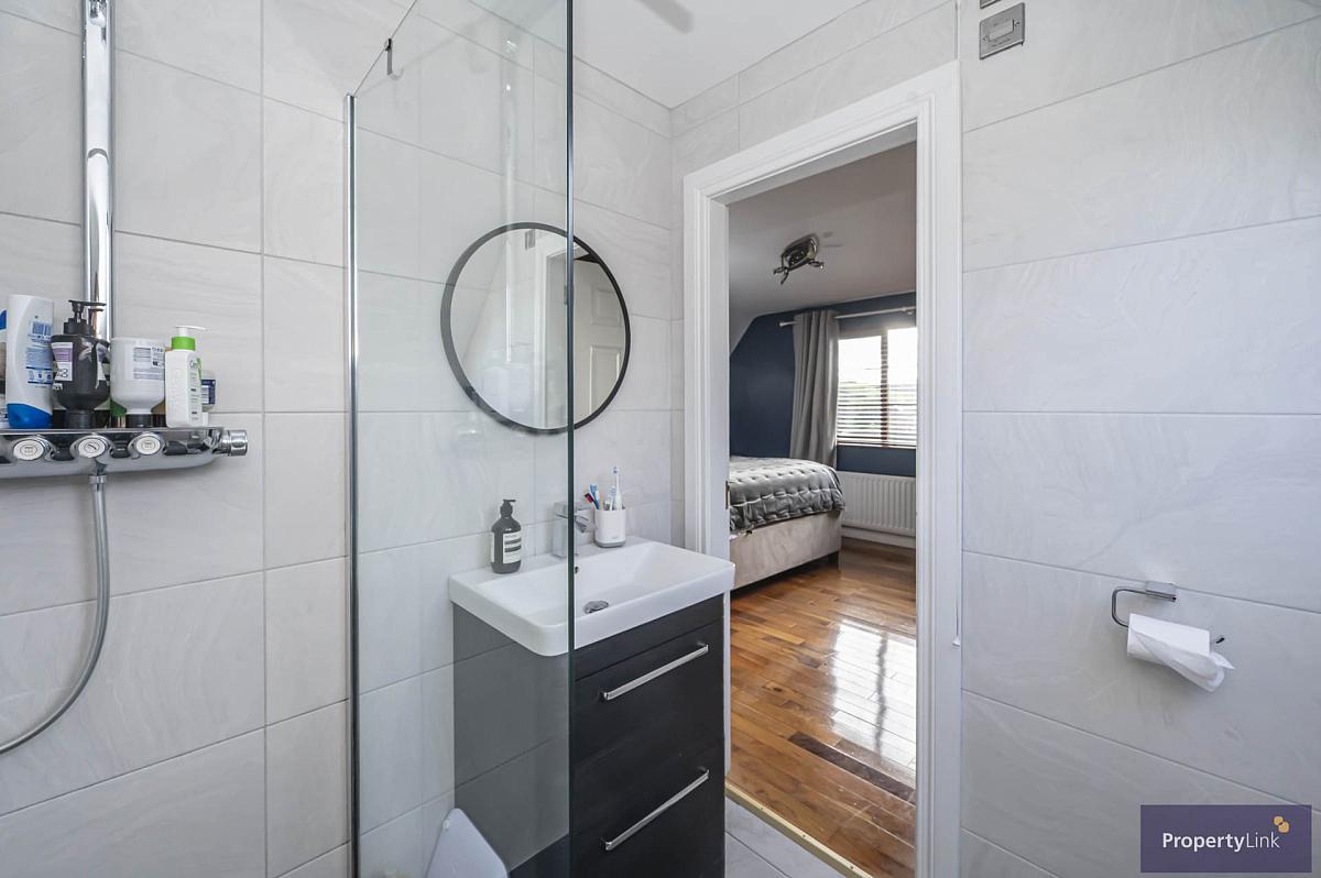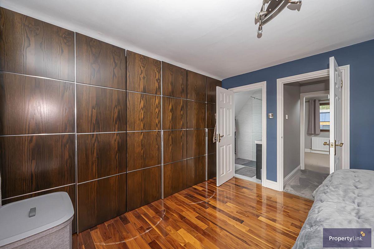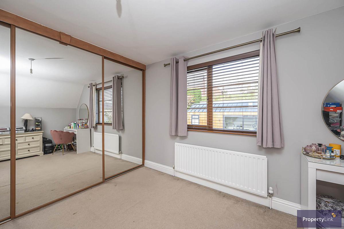 Currently used as the master bedroom offering ample space to house double bed, fitted wardrobes, frontal aspect window views, wooden floor and en-suite to include walk in shower with rain head, floating sink in vanity, low flush wc and ceramic tiled floor.