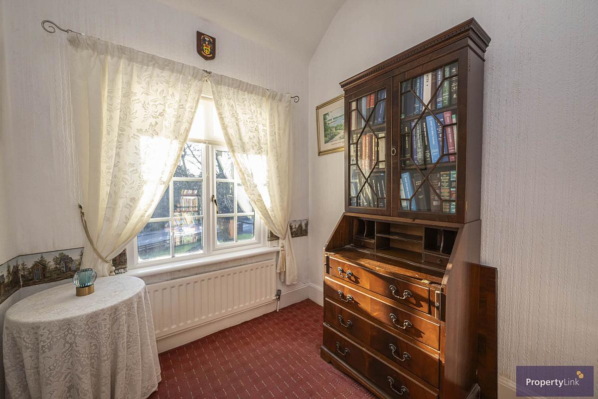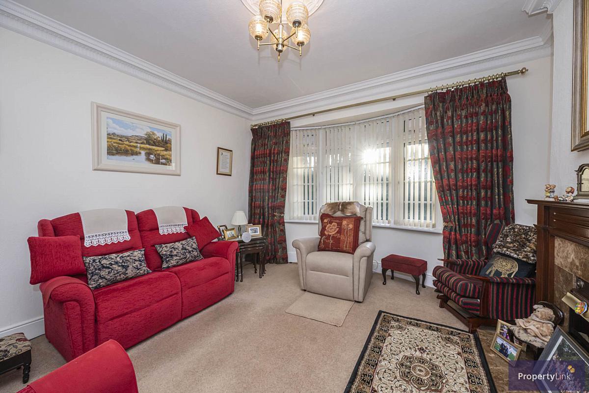 A second generous reception room offering access to both the kitchen and entrance hall, carpet floor covering, frontal aspect window views and feature mahogany fire place.