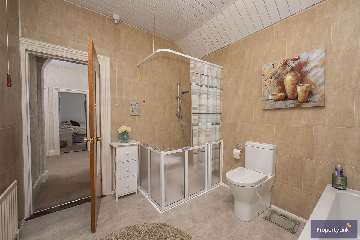 Four piece suite to include panel bath, low flush WC, walk in shower, sink in vanity and PVC floor and walls.