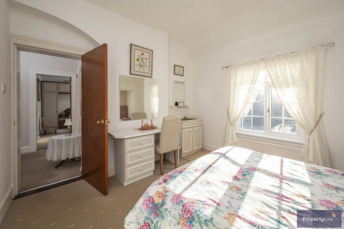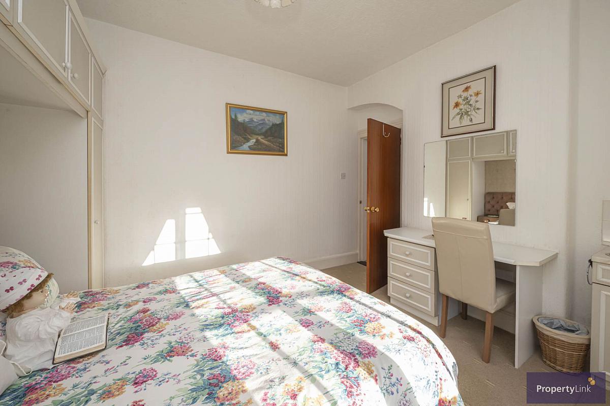 A second generous double bedroom offering frontal aspect window views, carpet floor covering, fitted wardrobes and sink in vanity.