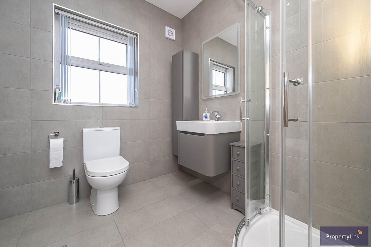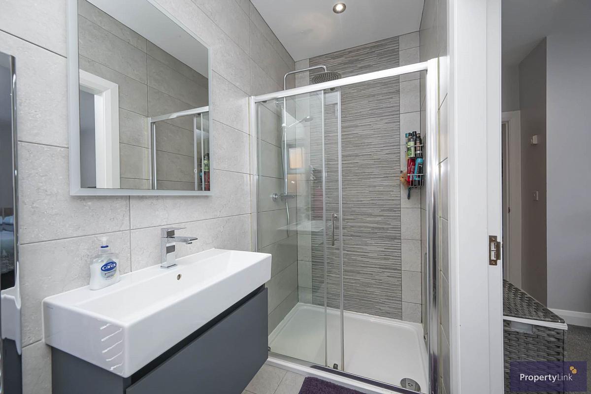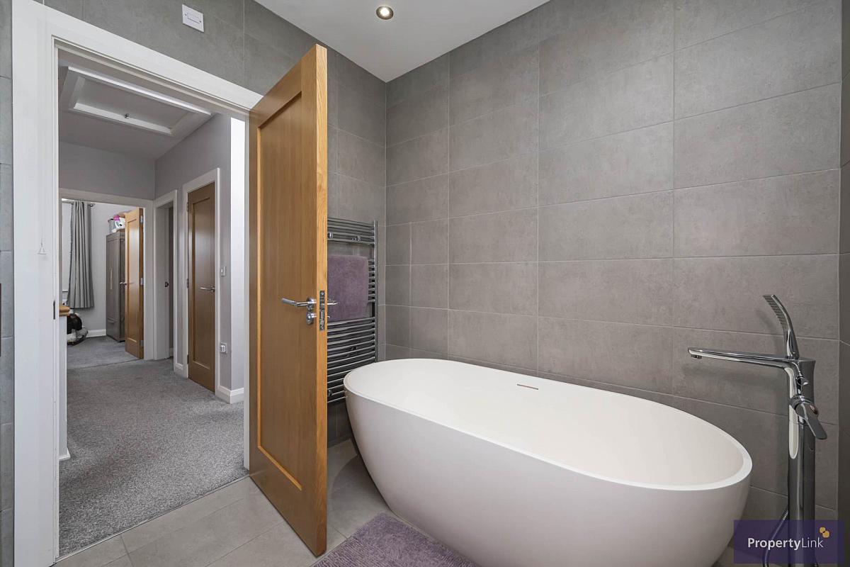 Four piece suite to include floating wash hand basin, low flush wc, free standing bath, corner shower, heated towel rail and ceramic tiled floor and walls.