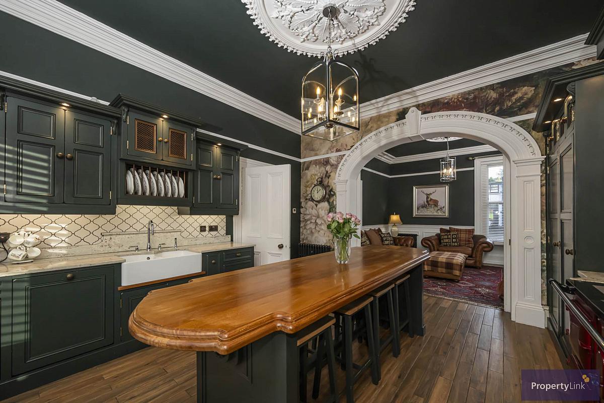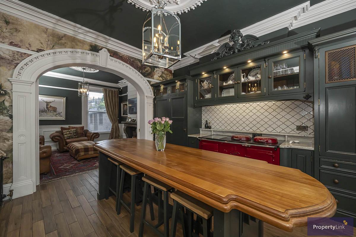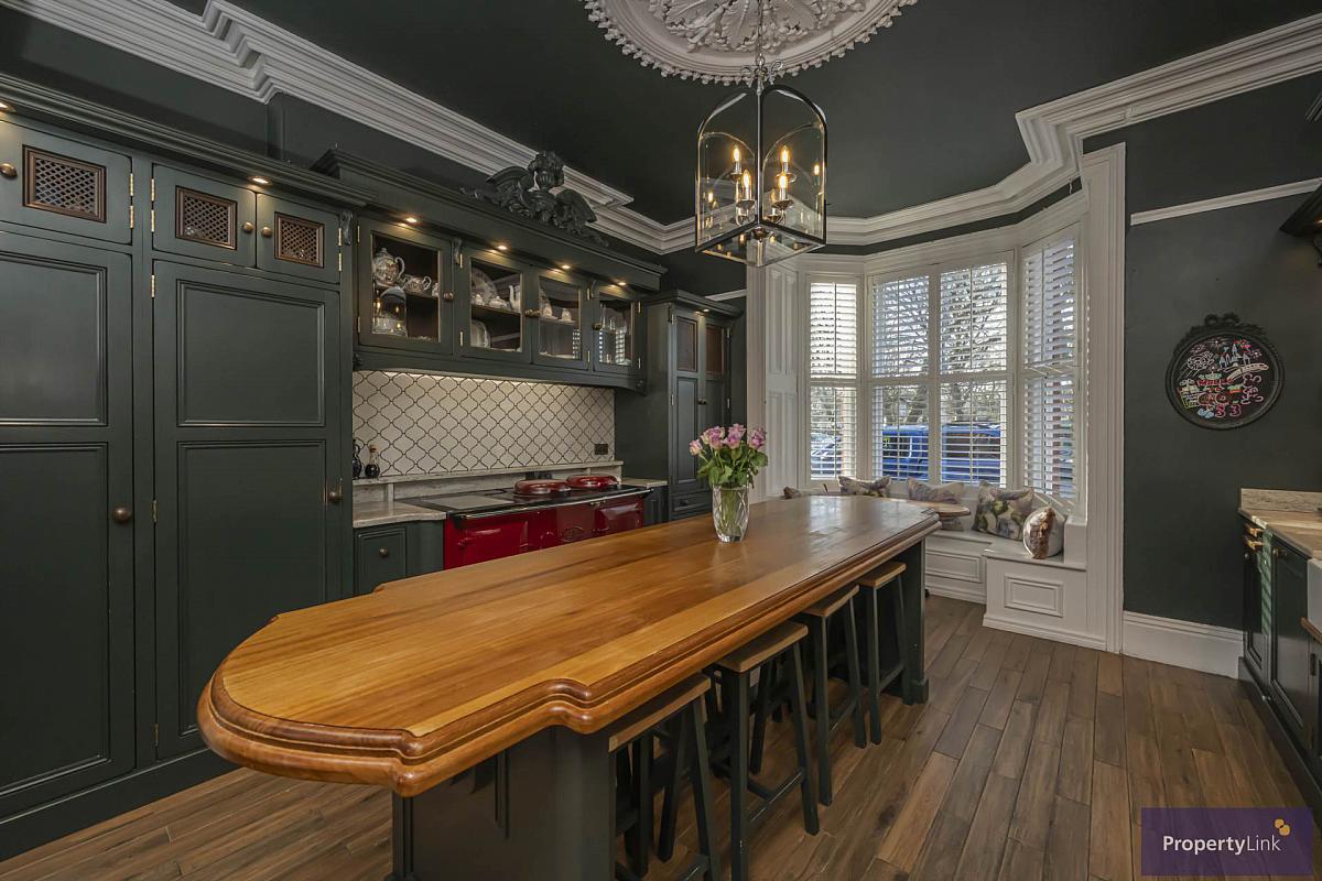 This beautifully appointed kitchen/dining space is a striking blend of classic elegance and contemporary craftsmanship. Offering rich bespoke hand painted fitted units to include belfast sink, intergrated dishwasher, fridge/freezer and pantry storage. The statement AGA range cooker provides a vocal point in the kitchen along with an impressive solid wood island with generous seating, ideal for both everyday living and entertaining. A charming bay window offering fitted shutters and seating area, perfect for extra dining space. This thoughtfully designed kitchen/dining area offers both practicality and character, making it a stand out feature of the home.