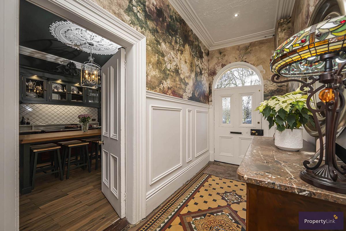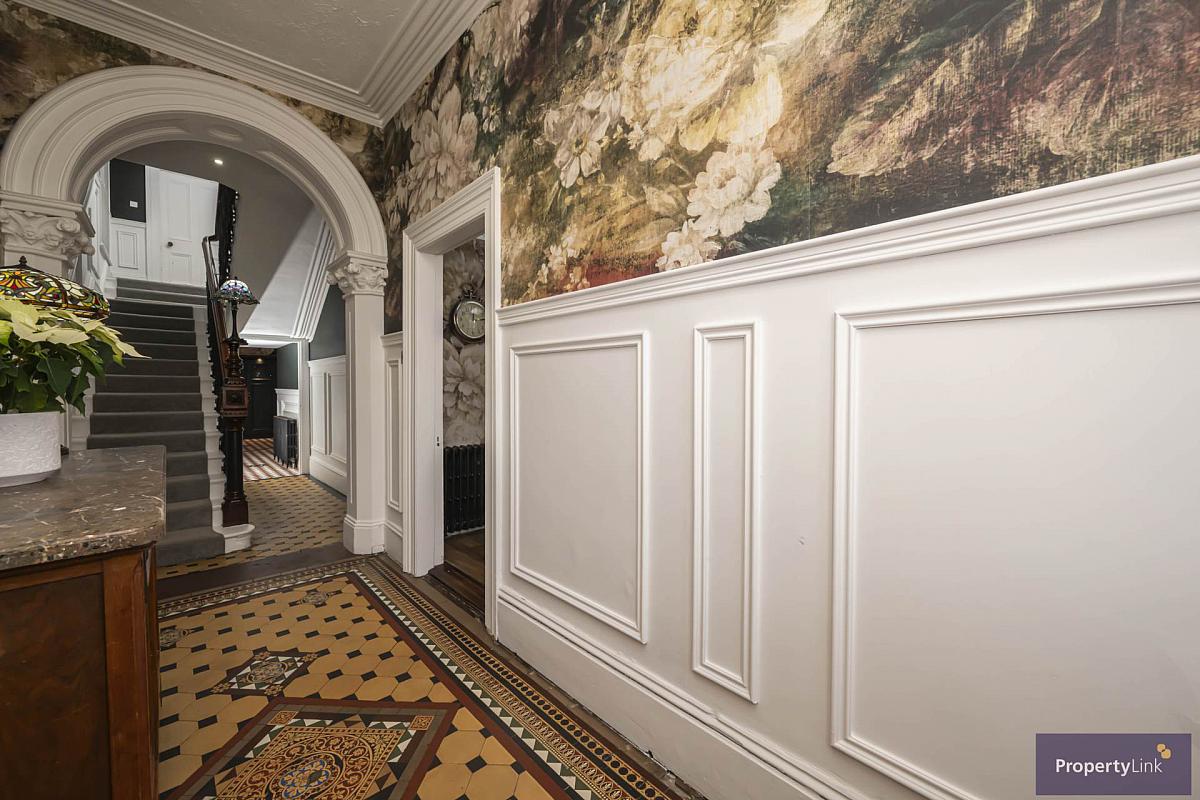 This impressive entrance hall way, full of character, features elegant arched doorways, ornate plaster work, high ceilings, wall panelling and traditional ceramic floor tiles all reflecting the properties heritage leading to all aspects of the home.
