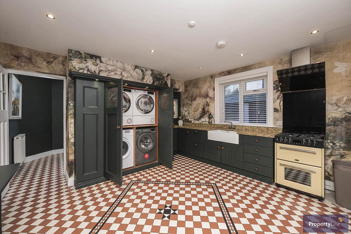 Combining character with modern practically this room offers fitted units with ample storage, Belfast sink, gas cooker and concealed cupboards to house stacked auto washers, keeping the space organised and uncluttered.