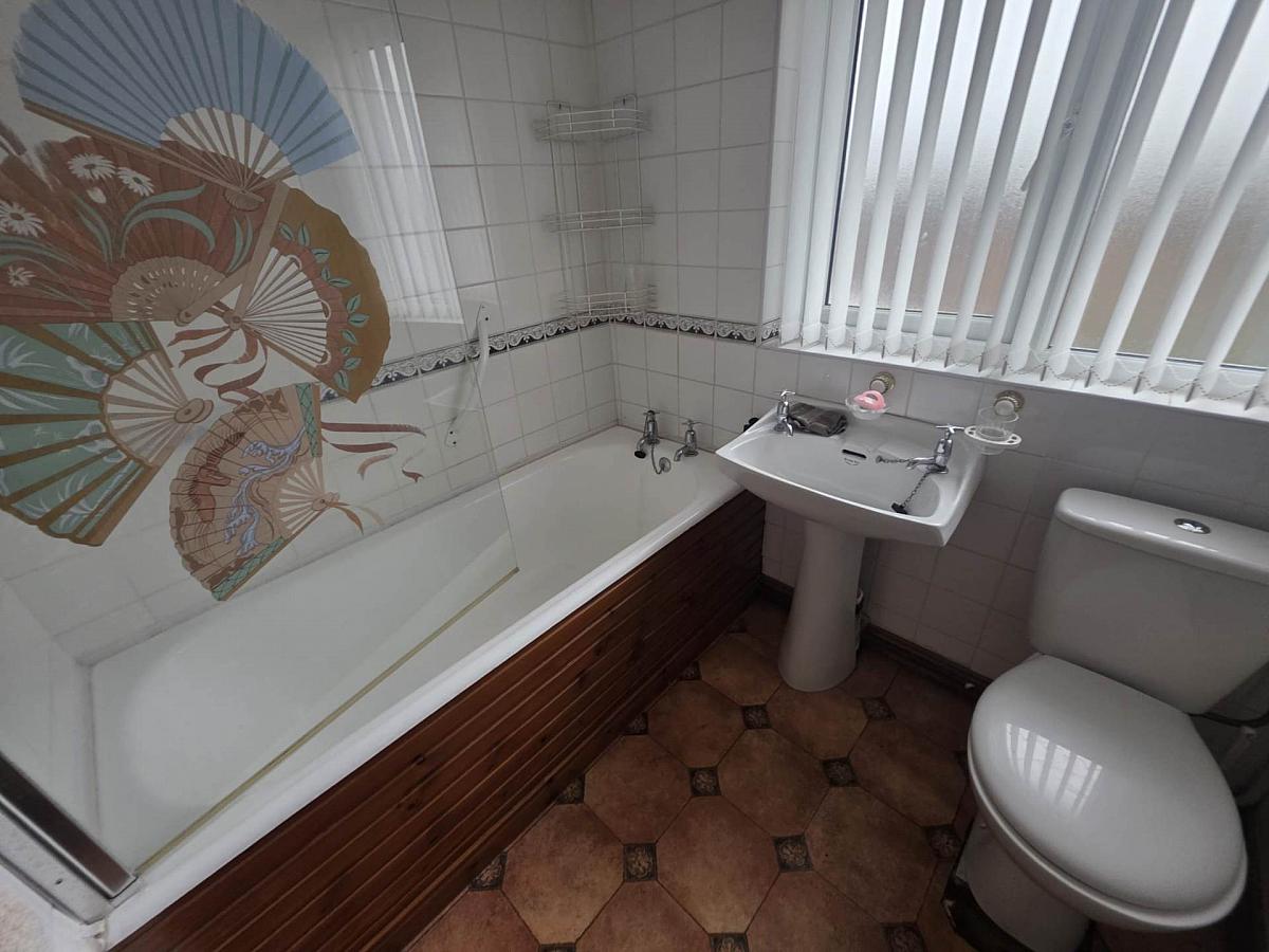 Three piece suite to include pedestal wash hand basin, low flush WC, panel with with electric shower over and lino floor covering.