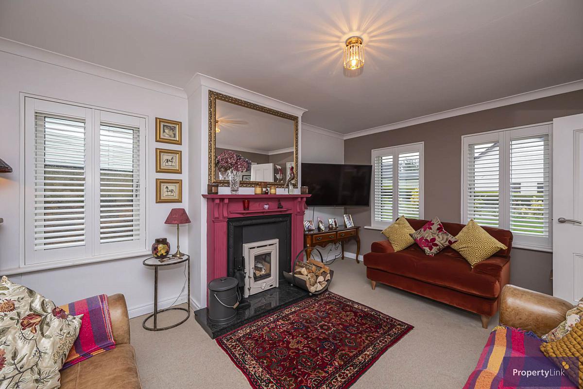 Frontal aspect room offering, feature painted fireplace with wood burning stove inset and marble hearth.