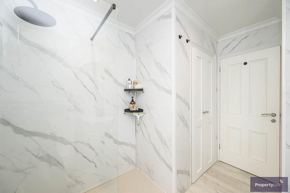 Offering walking shower with rain head, floating wash hand basin and WC, towel heater, tiled floor and hotpress.
