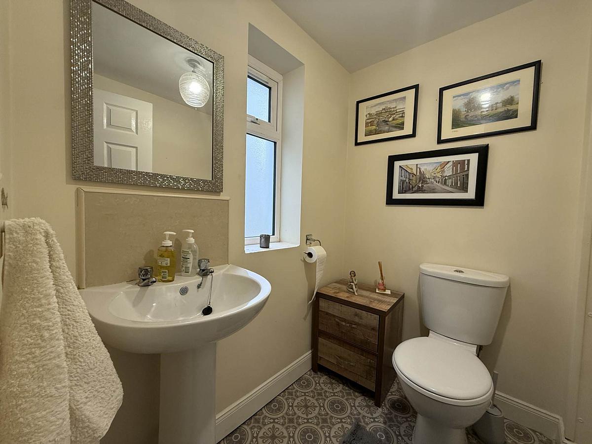 Downstairs WC offering low flush WC, pedestal wash hand basin and lino floor covering.