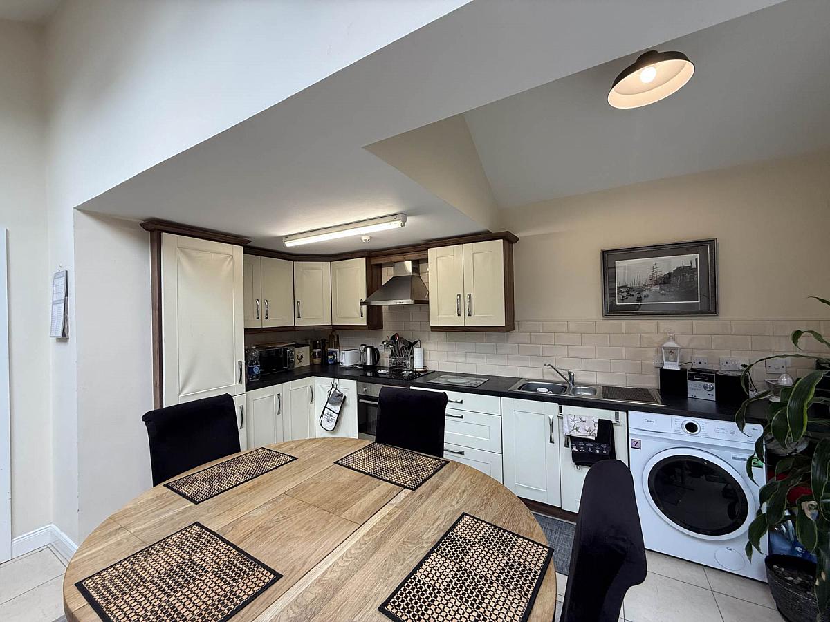 Composing of fitted units to include stainless steel sink and drainer, intergrated fridge/freezer, electric oven with hob and extractor fan over, ceramic tiled floor, ample space to house dining table and patio doors leading to outside.