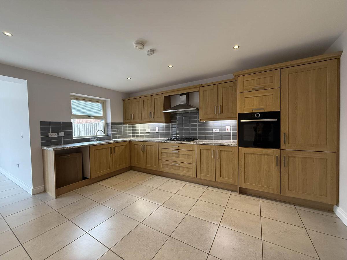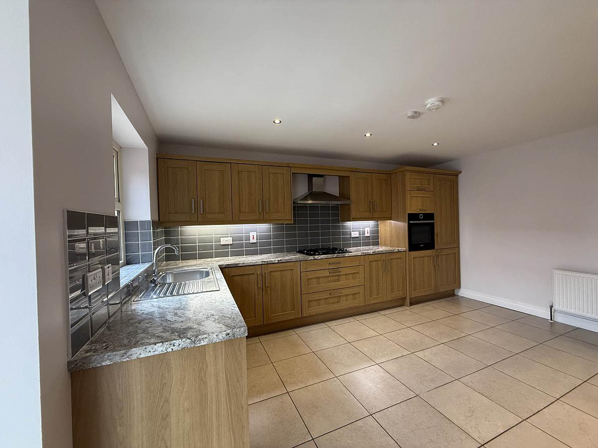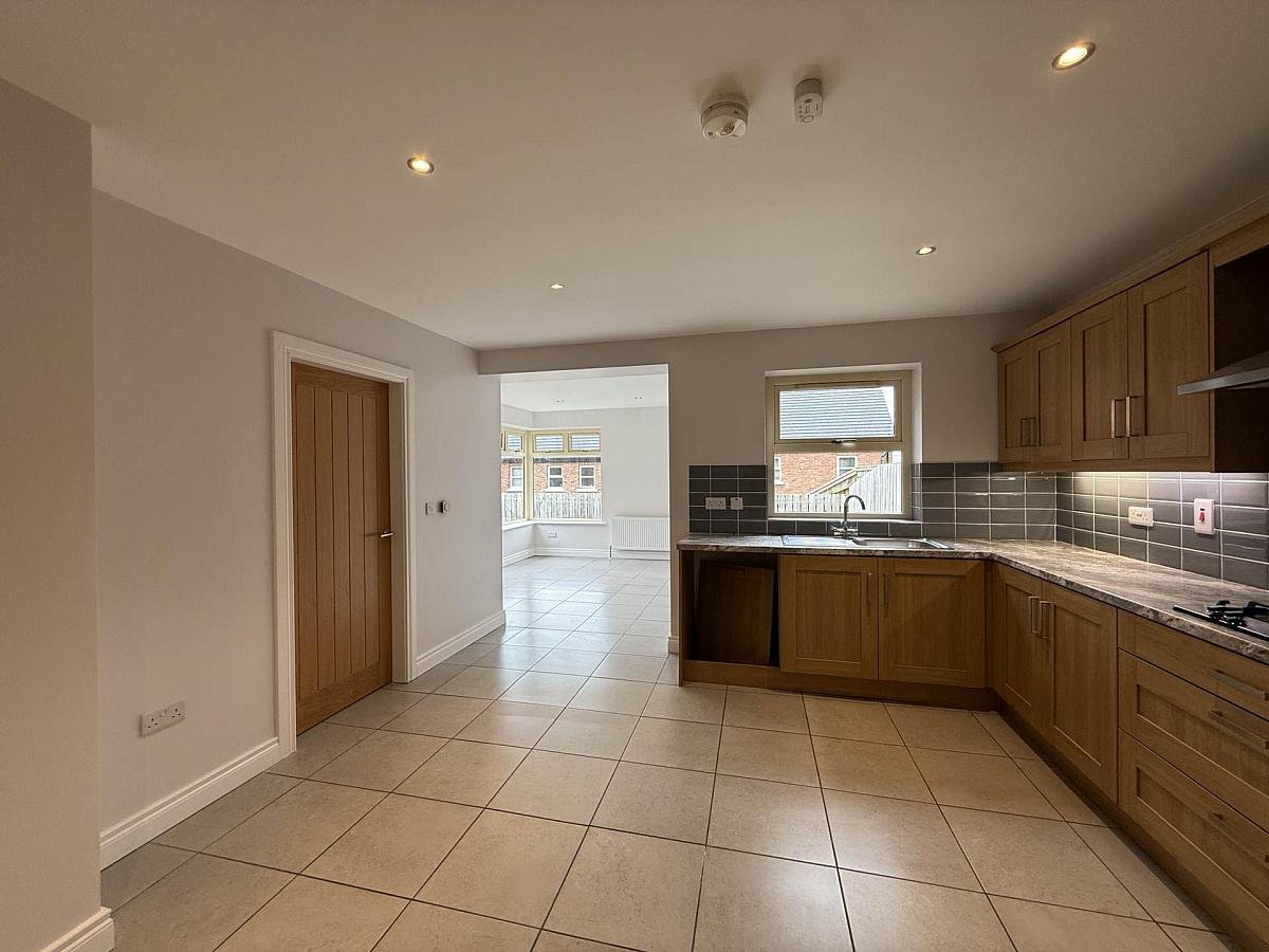 Offering fitted units to include gab hob with extractor over, high level electric oven, intergrated fridge/freezer, space for dishwasher, stainless steel sink and drainer, ceramic tiled floor, ample space to house dining table and open plan to the sun lounge.