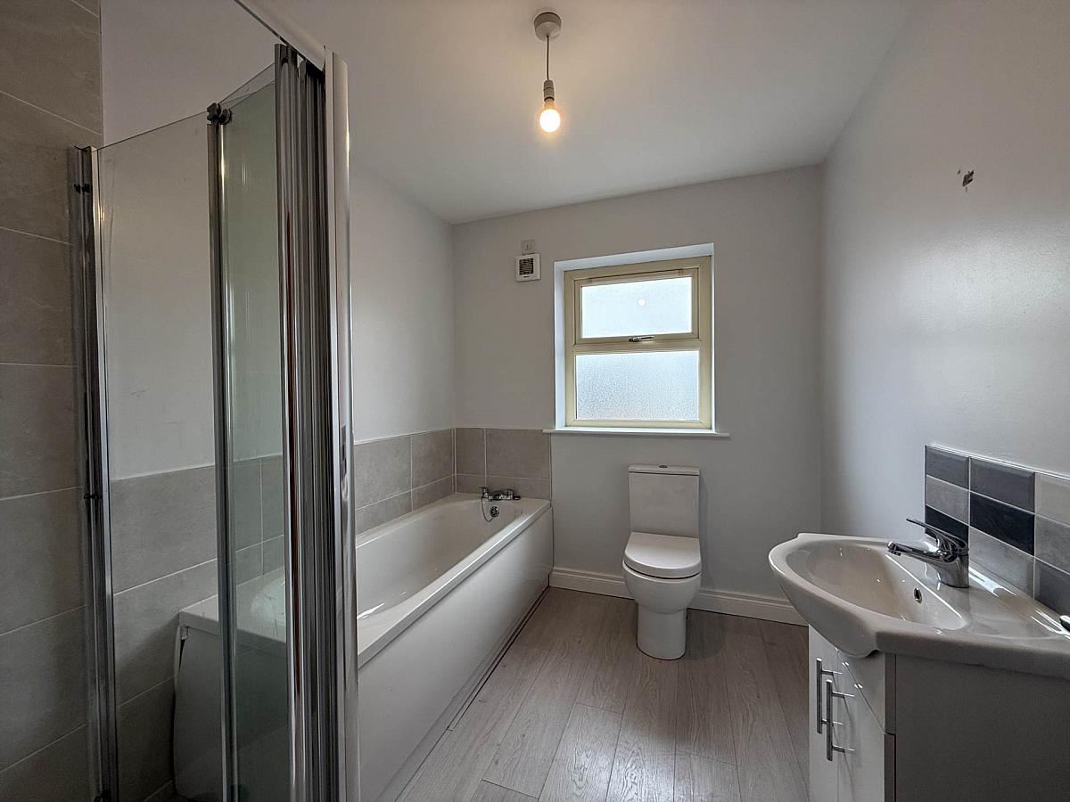 Offering four piece to include sink in vanity, low flush WC, panel bath, shower and laminate wooden floor.