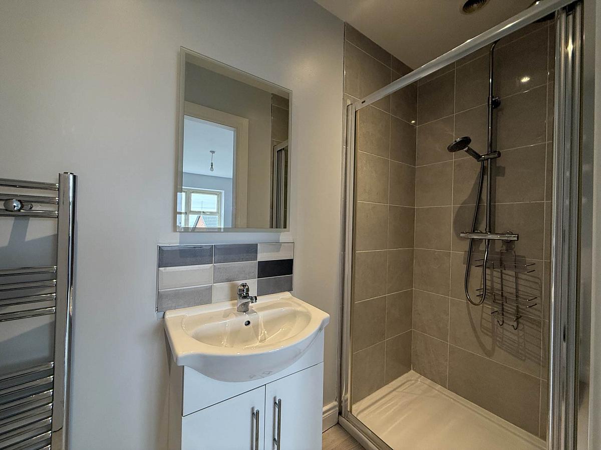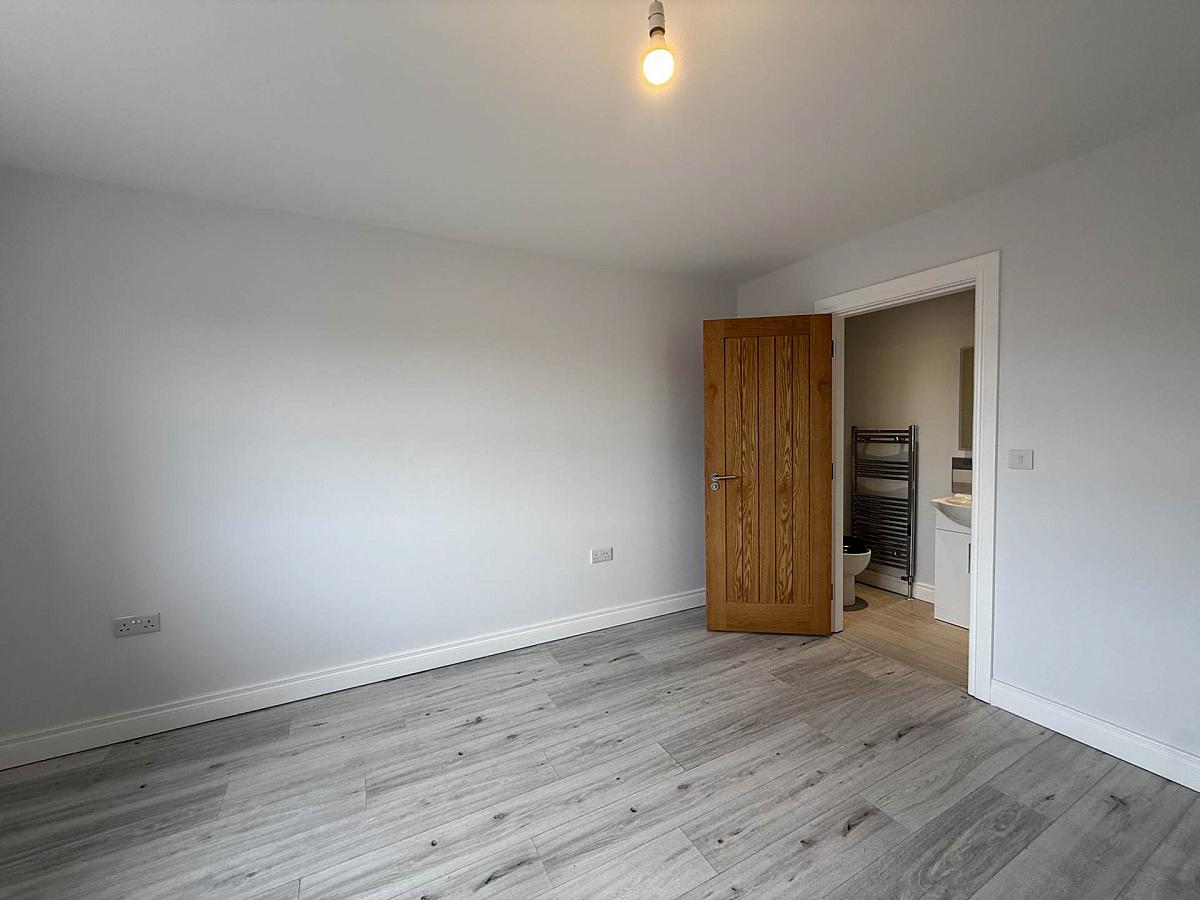 Rear aspect master bedroom offering ample space to house double bed, laminate wooden floor and en-suite to include sink in vanity, low flush wc, shower and laminate wooden floor.