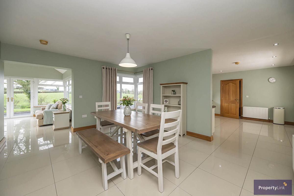 Offering rear aspect window views, ceramic tiled floor, ample space to house dining table, open plan to kitchen and sun room.