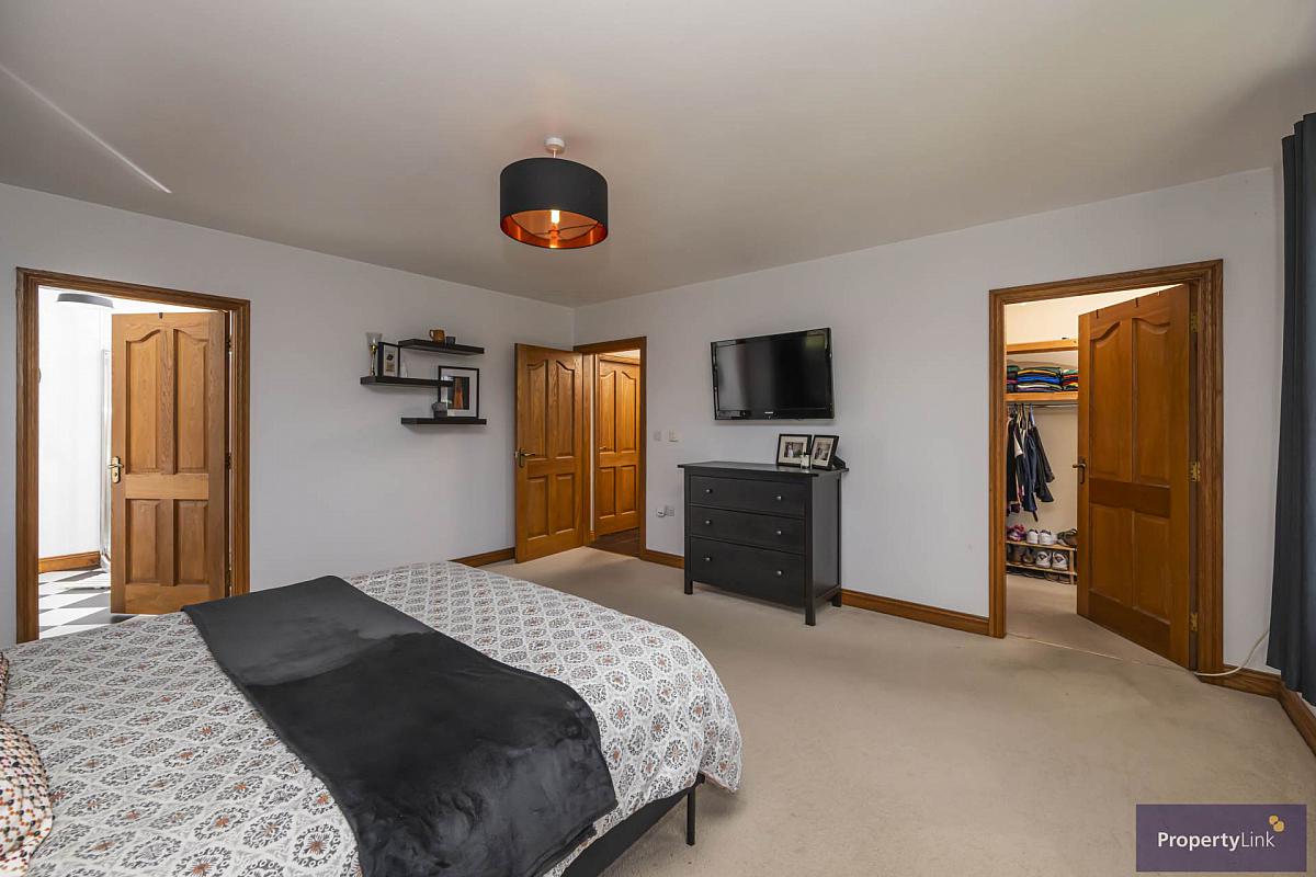 Master bedroom offering rear aspect window views, carpet floor covering, ample space to house double bed, walk in wardrobe and en suite to include low flush wc, pedestal wash hand basin, shower and ceramic tiled floor.