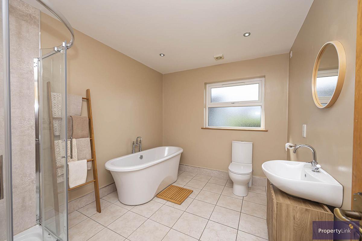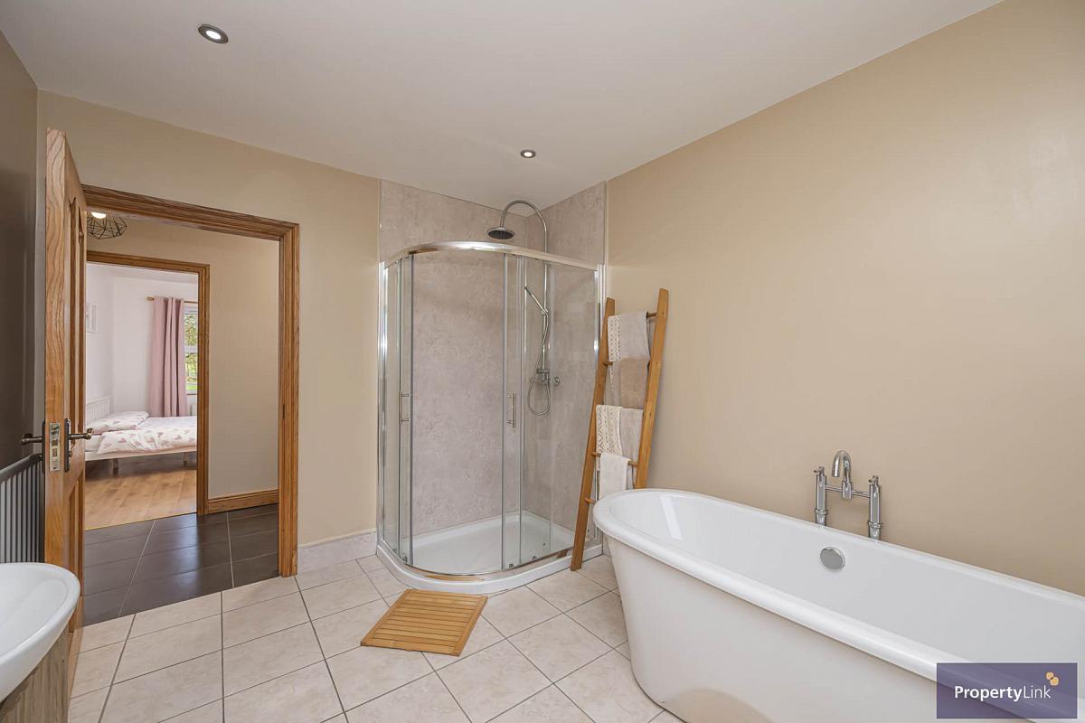 Composing of pedestal wash hand basin, low flush WC, free standing bath, shower with rain head and ceramic tiled floor.