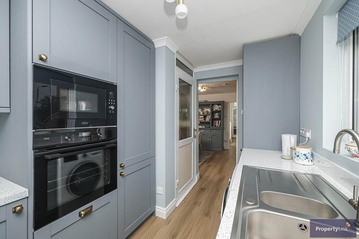 Modernised kitchen with high and low level units, stainless steel sink & drainer, integrated oven, hob and extractor fan, integrated fridge freezer and space for auto washer. Finished with hybrid flooring. Pvc door leading to the rear.