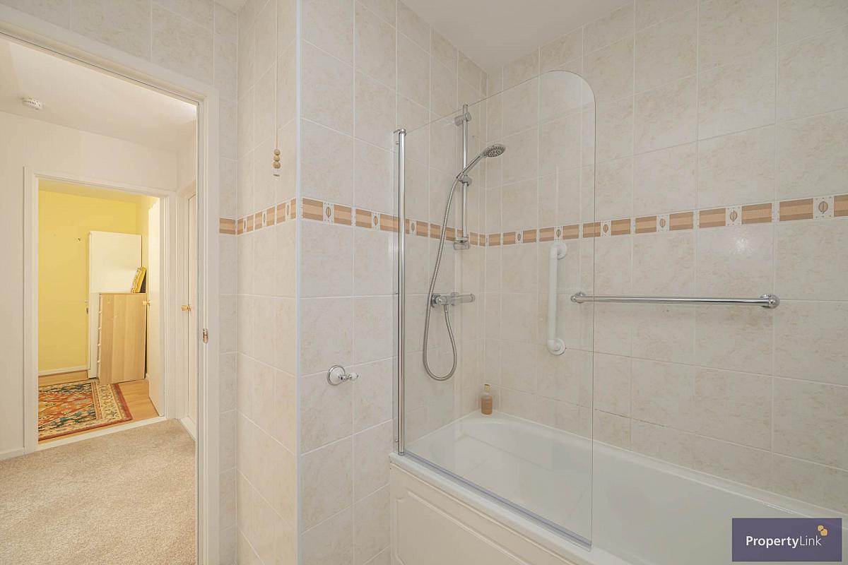 Tastefully finished, fully tiled, bathroom suite to include a low flush wc, vanity unit with wash hand basin and panelled bath with shower over.