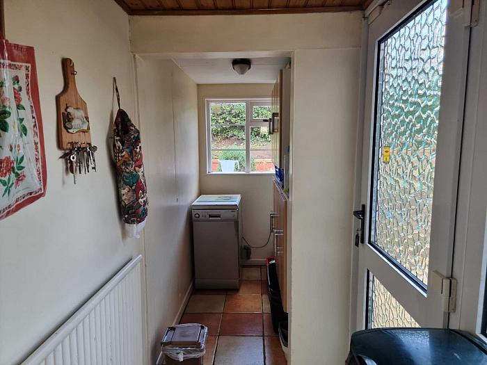 Fitted high and low level units, plumbed for dishwasher, PVC rear door with glazed inset, tiled floor.