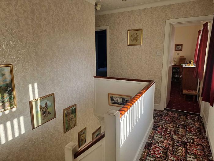 Electric door with pedestrian door to rear of garage. Over the garage there is a storage room which is accessed by steps to the rear of the garage and offers good storage.