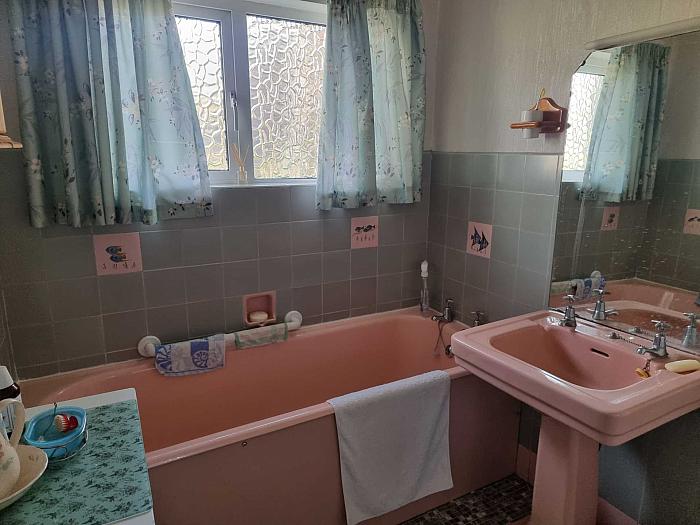 Coloured bathroom suite, cast iron bath, pedestal wash hand basin, part tiled walls, shelved hot press.
