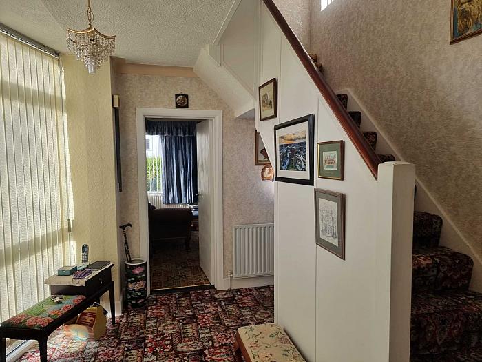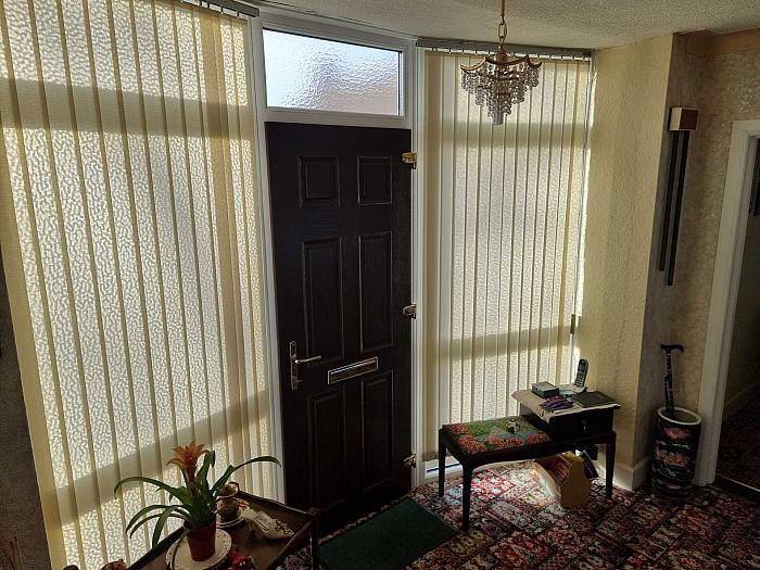 PVC front door with glazed inset and matching side panels. Storage cupboard under stairs.