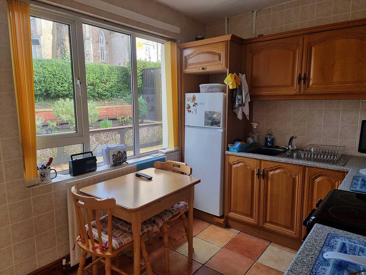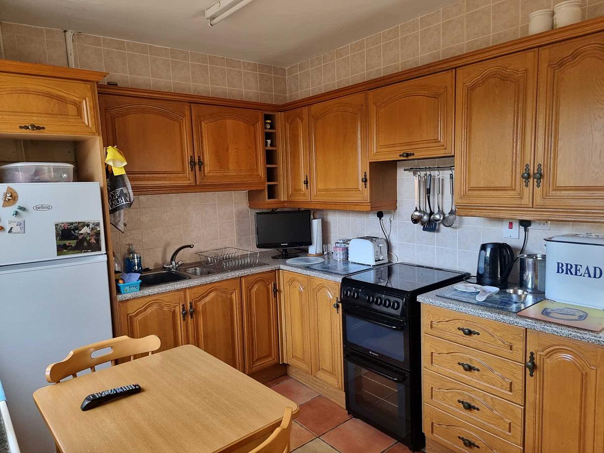 Oak effect high and low level fitted units, 1 1/2 bowl stainless steel sink and drainer unit, space for fridge freezer, electric cooker and extractor fan, tiled floor and part tiled walls. Direct access to rear hall.