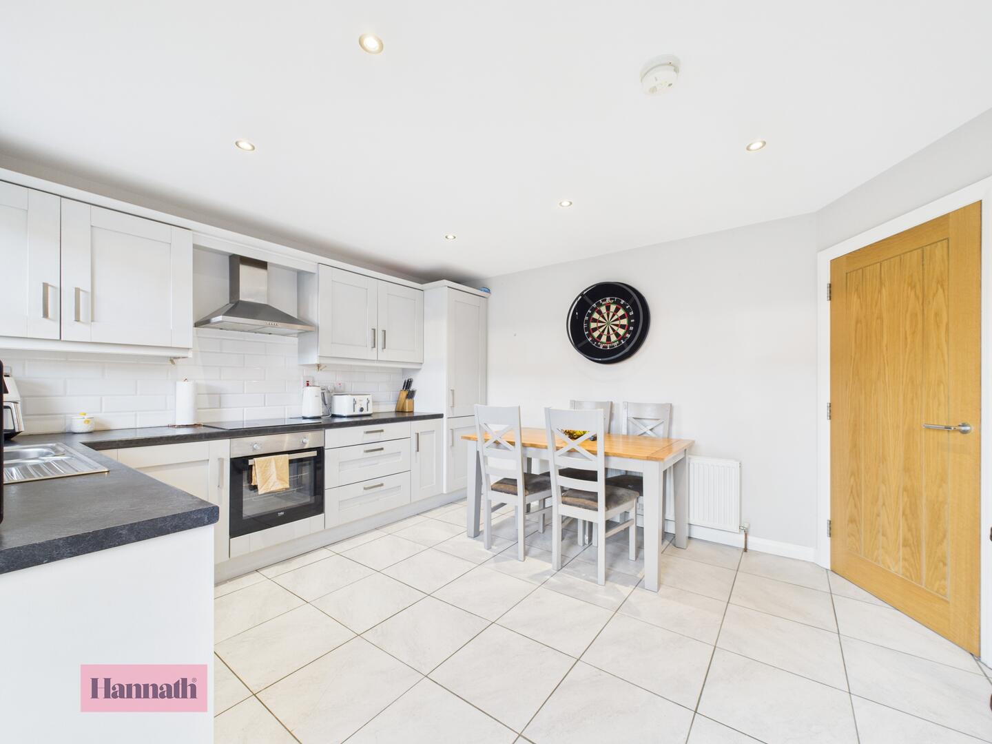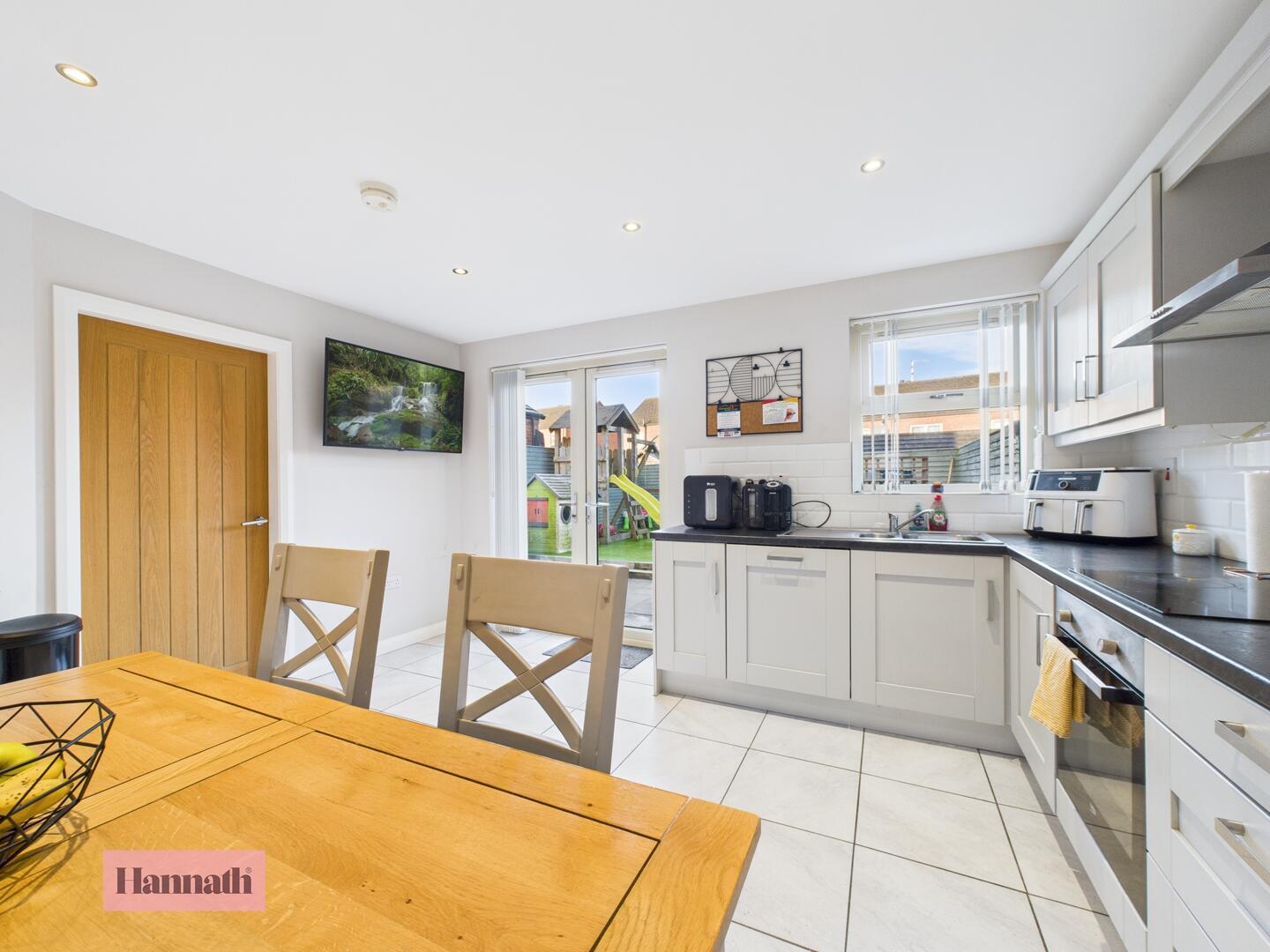 Range of high and low level units, built in appliances, tiled flooring, radiator, patio doors to rear