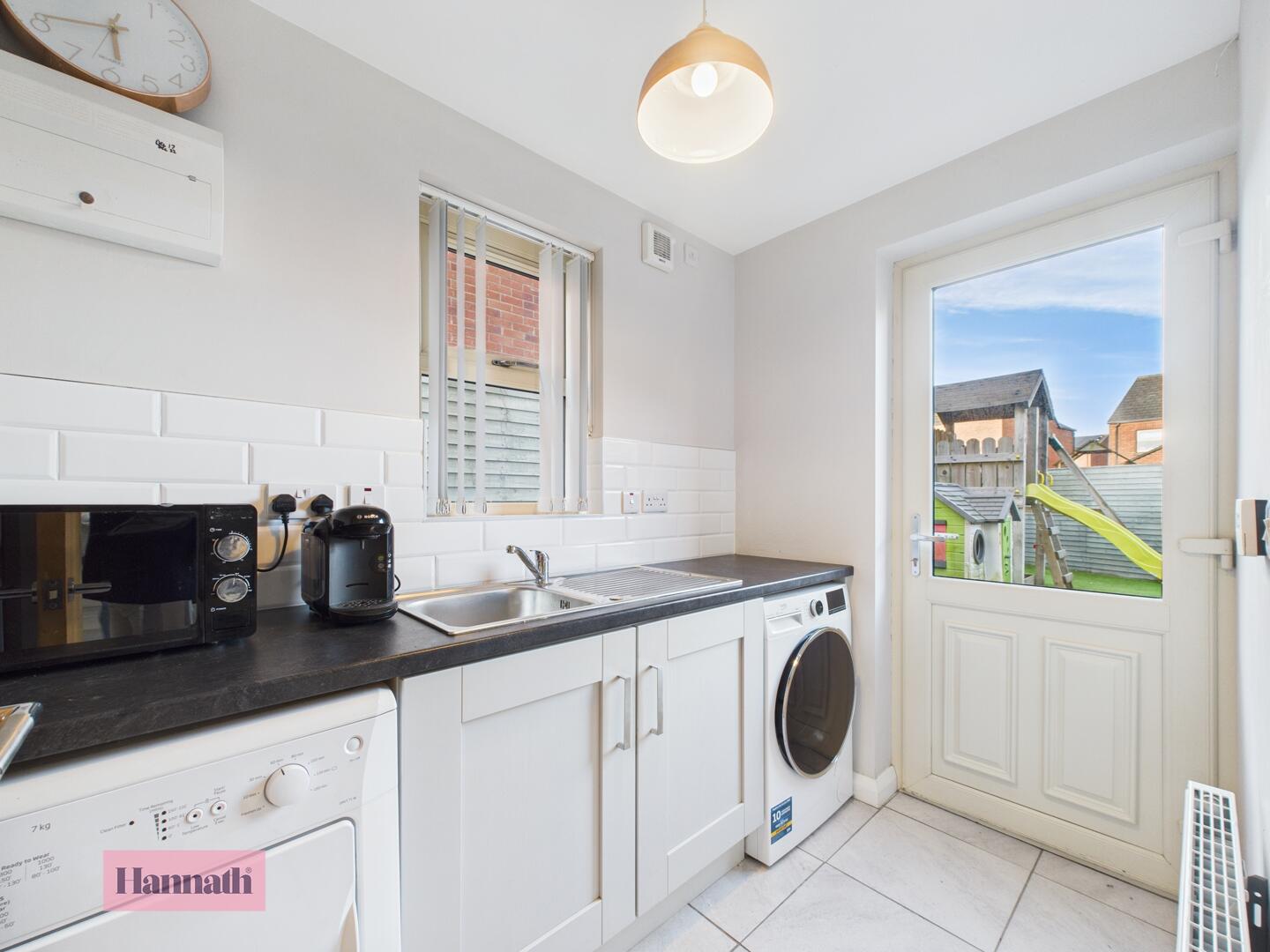 Space for washing machine and tumble dryer, sink with draining board, tiled flooring, radiator, back door to rear