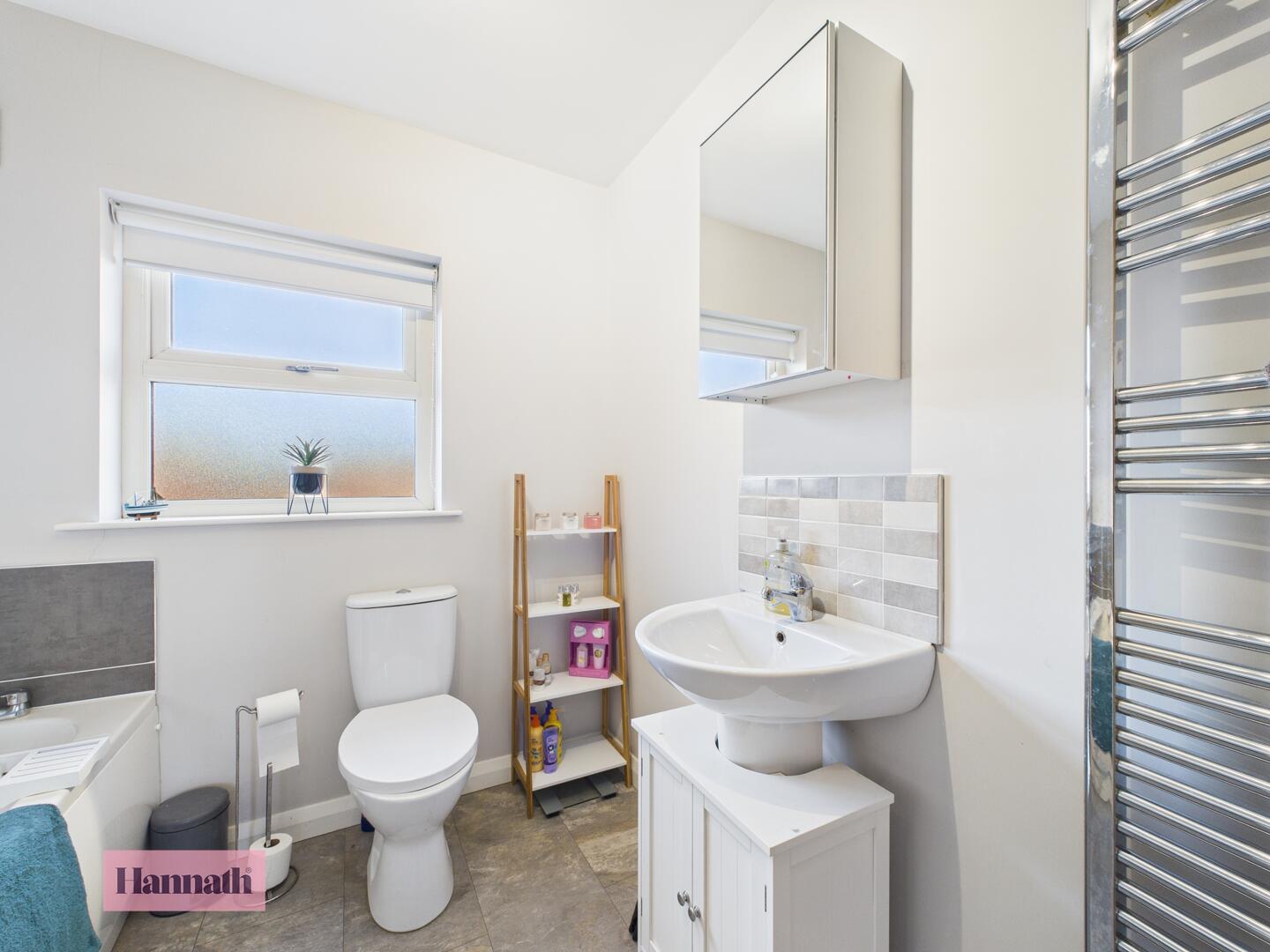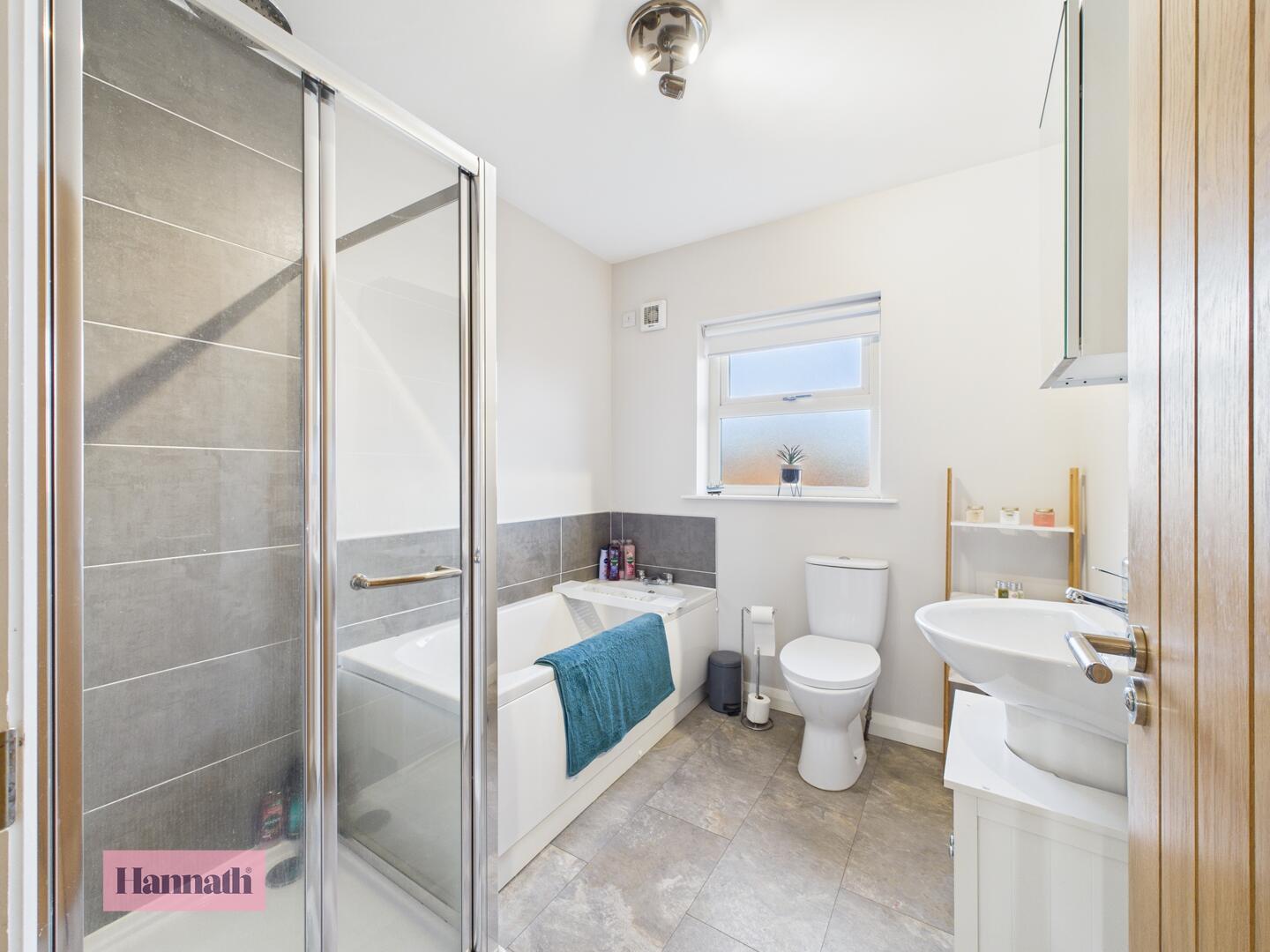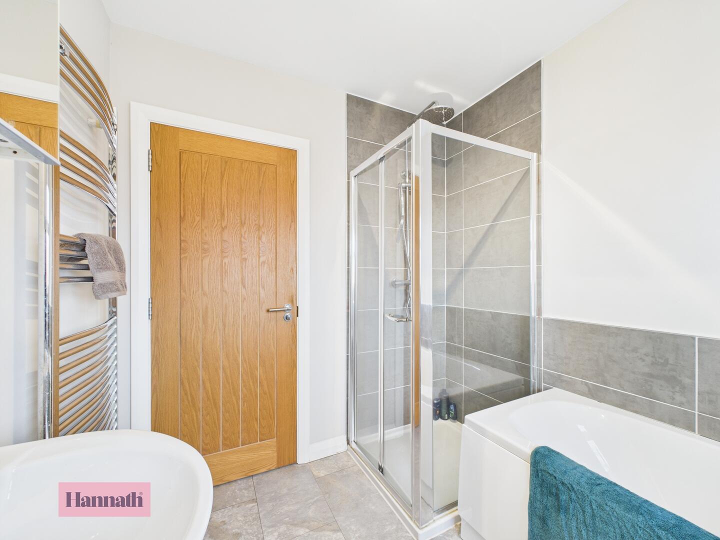 Four piece bathroom suite, shower cubicle, bath, wash hand basin, w.c., tiled flooring, part tiled walls, heated towel rail