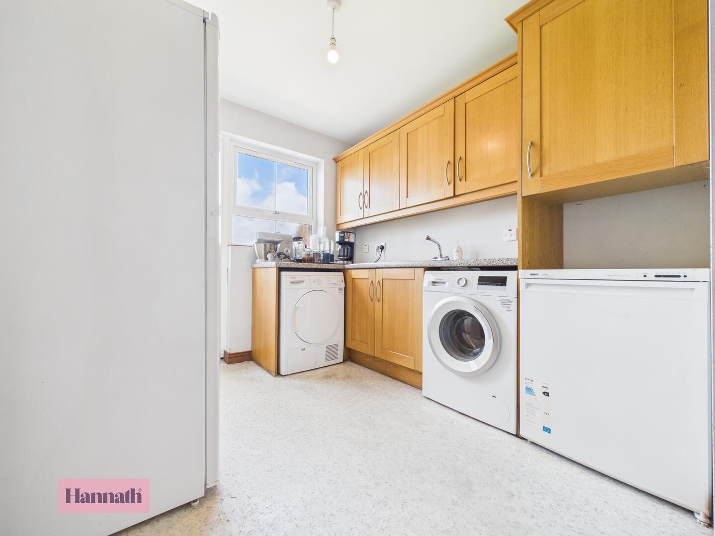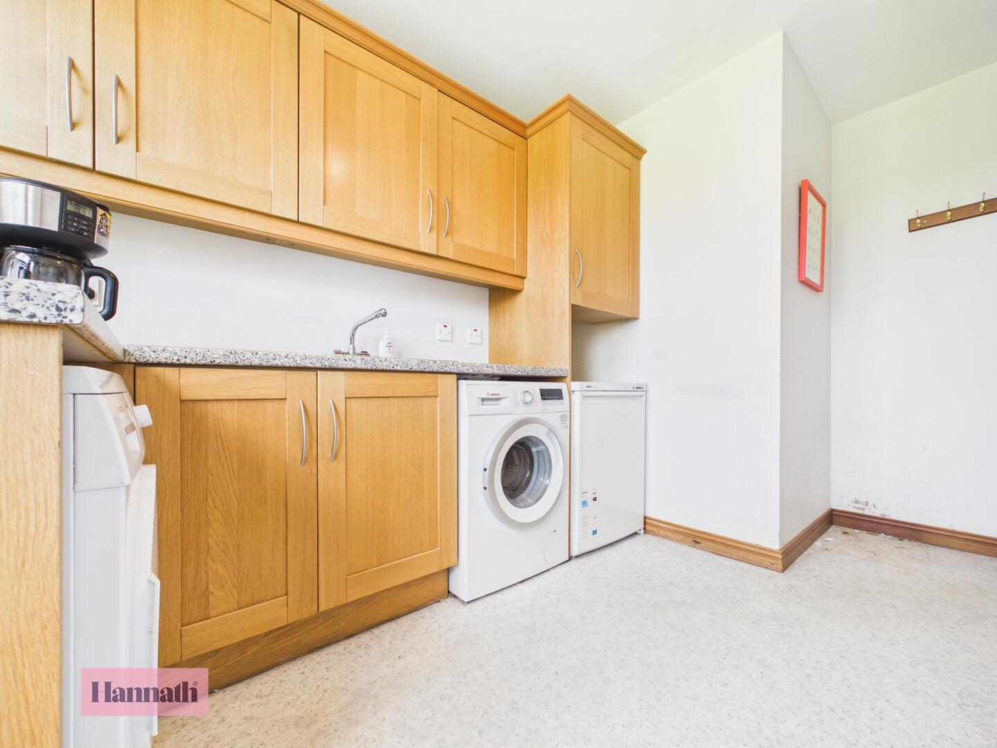The utility room is neatly arranged with plenty of storage cabinets and space for appliances including a washing machine and tumble dryer. It benefits from natural light via a window and has a door leading outside, making this a practical and convenient space.
