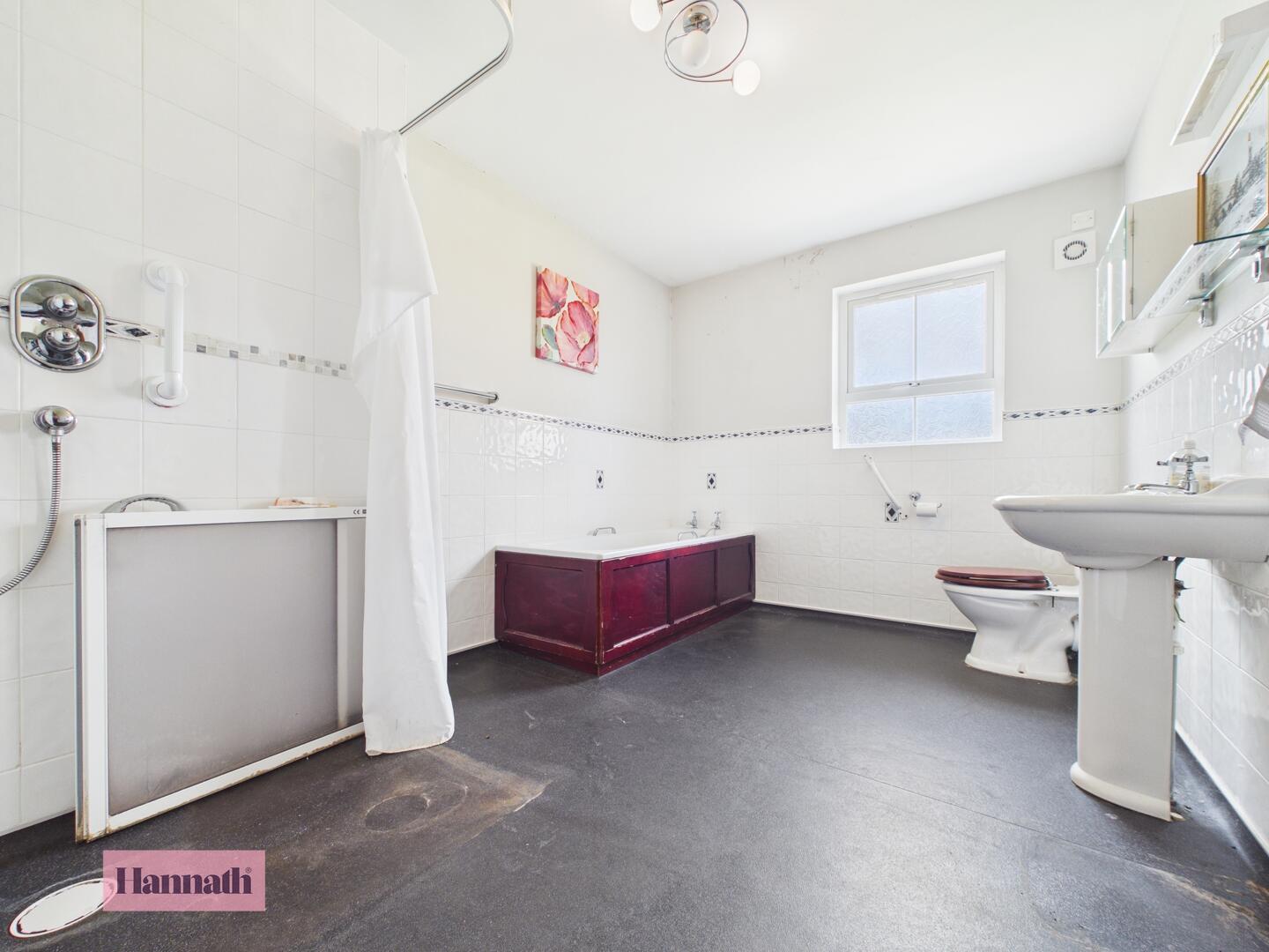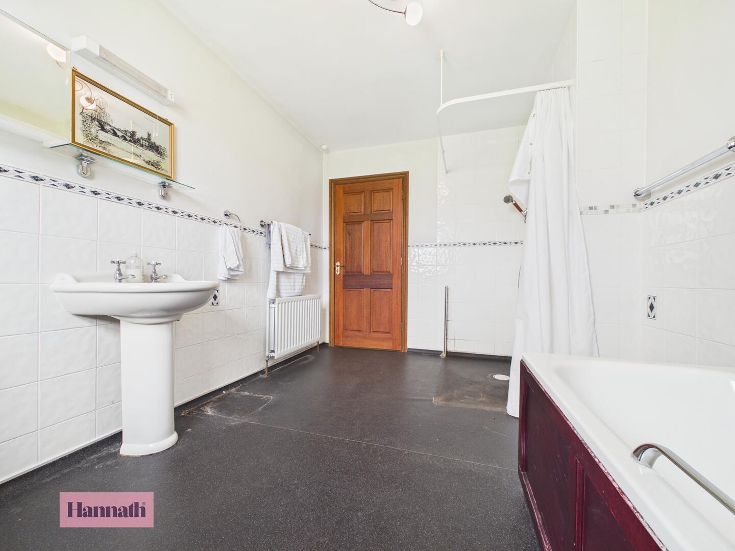 The bathroom is spacious and practical, featuring a white tiled splashback and a deep burgundy bath panel. It includes a separate shower, pedestal sink, and toilet, with a window providing natural light and ventilation.